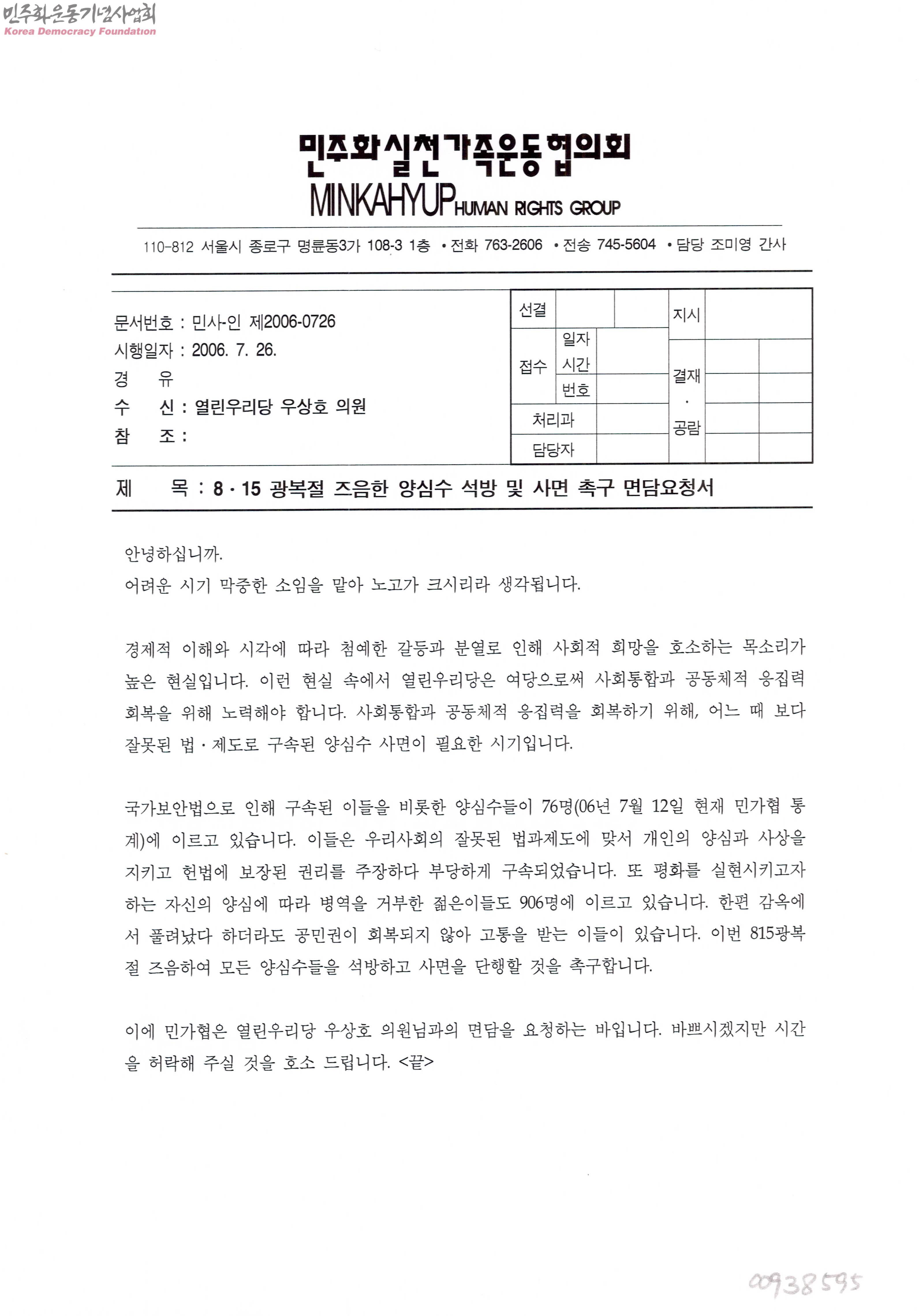 8.15광복절 즈음한 양심수 석방 및 사면 촉구 면담요청서[수신:열린우리당 우상호 의원]
