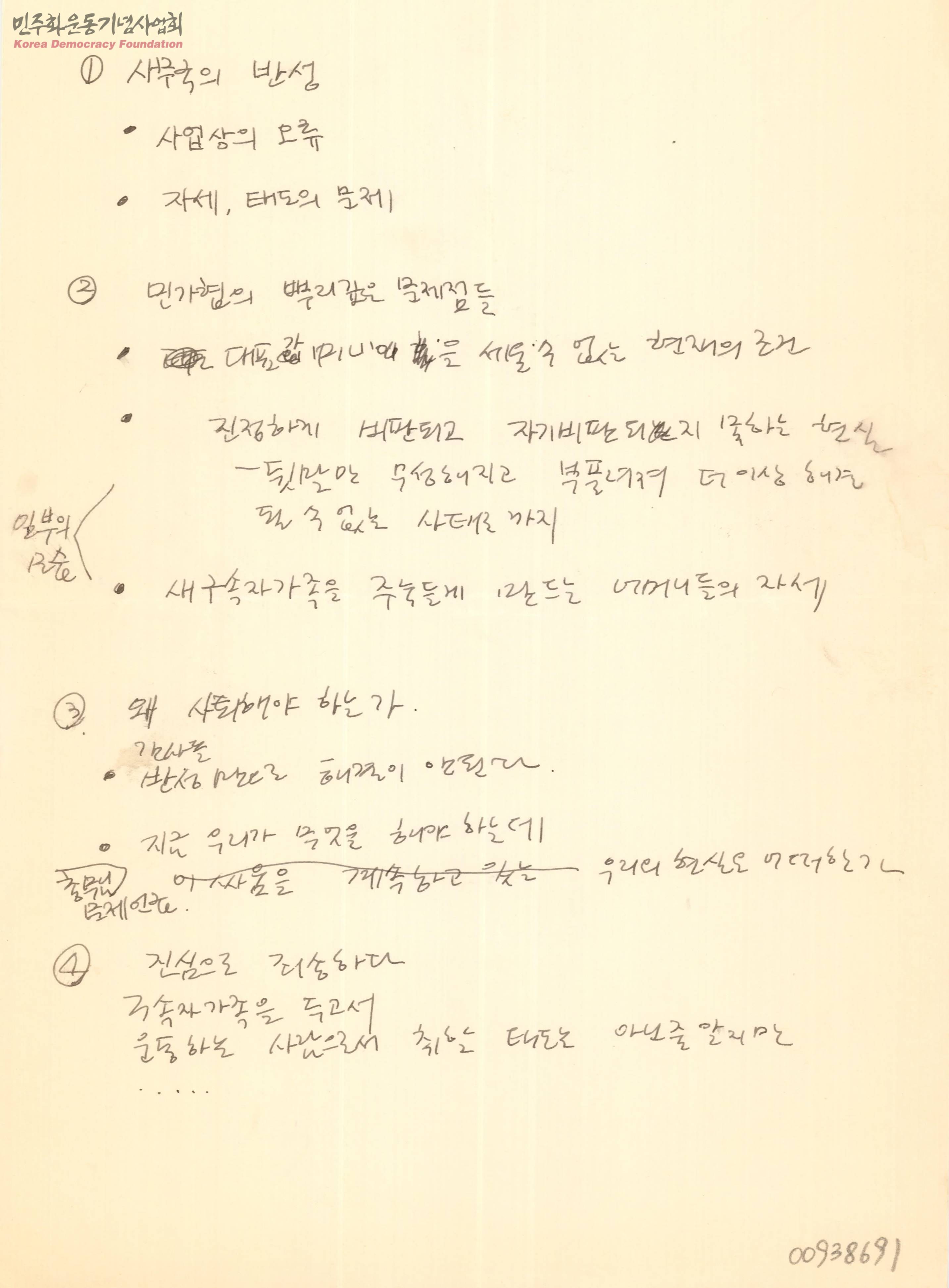 - 민가협 내부의 사업상의 오류와 총무의 권고사직 등에 대한 사죄와 운영의 어려움에 따른 반성을 담은 내용의 자필메모.