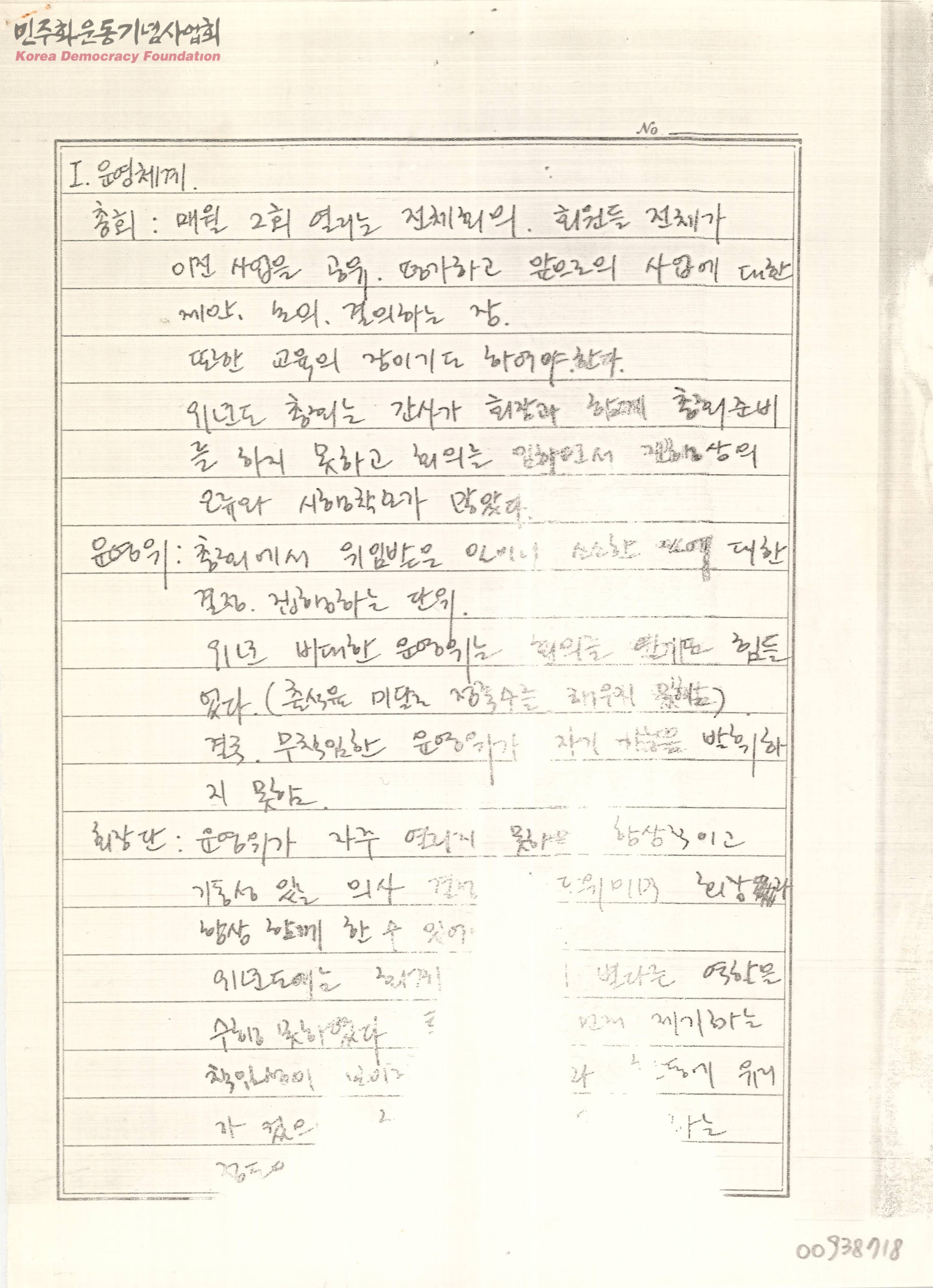 - 구학협의 운영체계(총회, 운영위, 회장단, 회장, 간사), 법정투쟁사업 , 회원의 조직화및 의식화에 관련된 내용의 수기 노트 복사 문서.