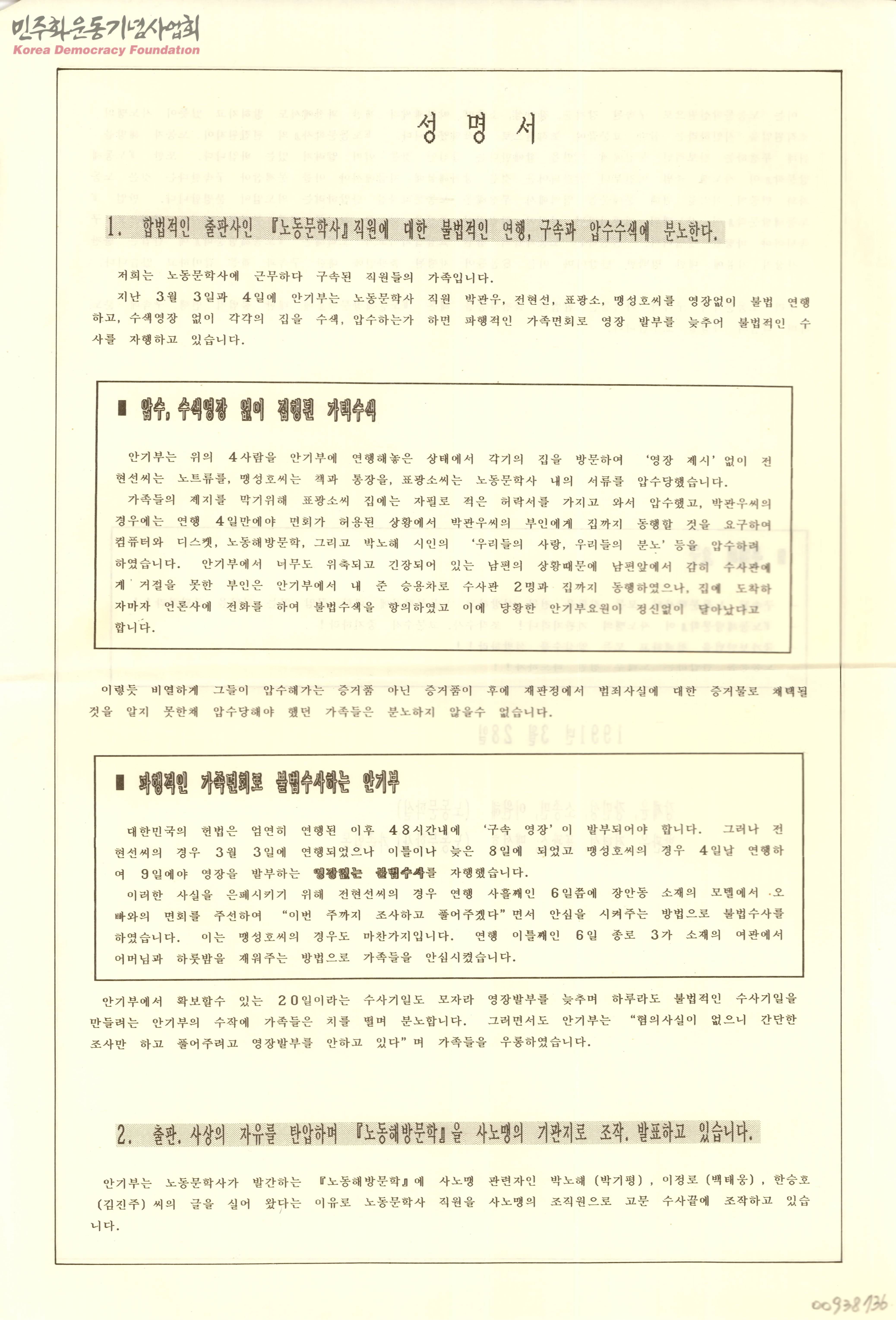 - 합법 출판사인 노동문학사 직원에 대한 불법적 연행 , 구속과 압수수색 내용, 출판.사상의 자유를 탄압하며 노동해방문학을 사노맹의 기관지로 조작.발표하고 있다는 주장과 요구내용