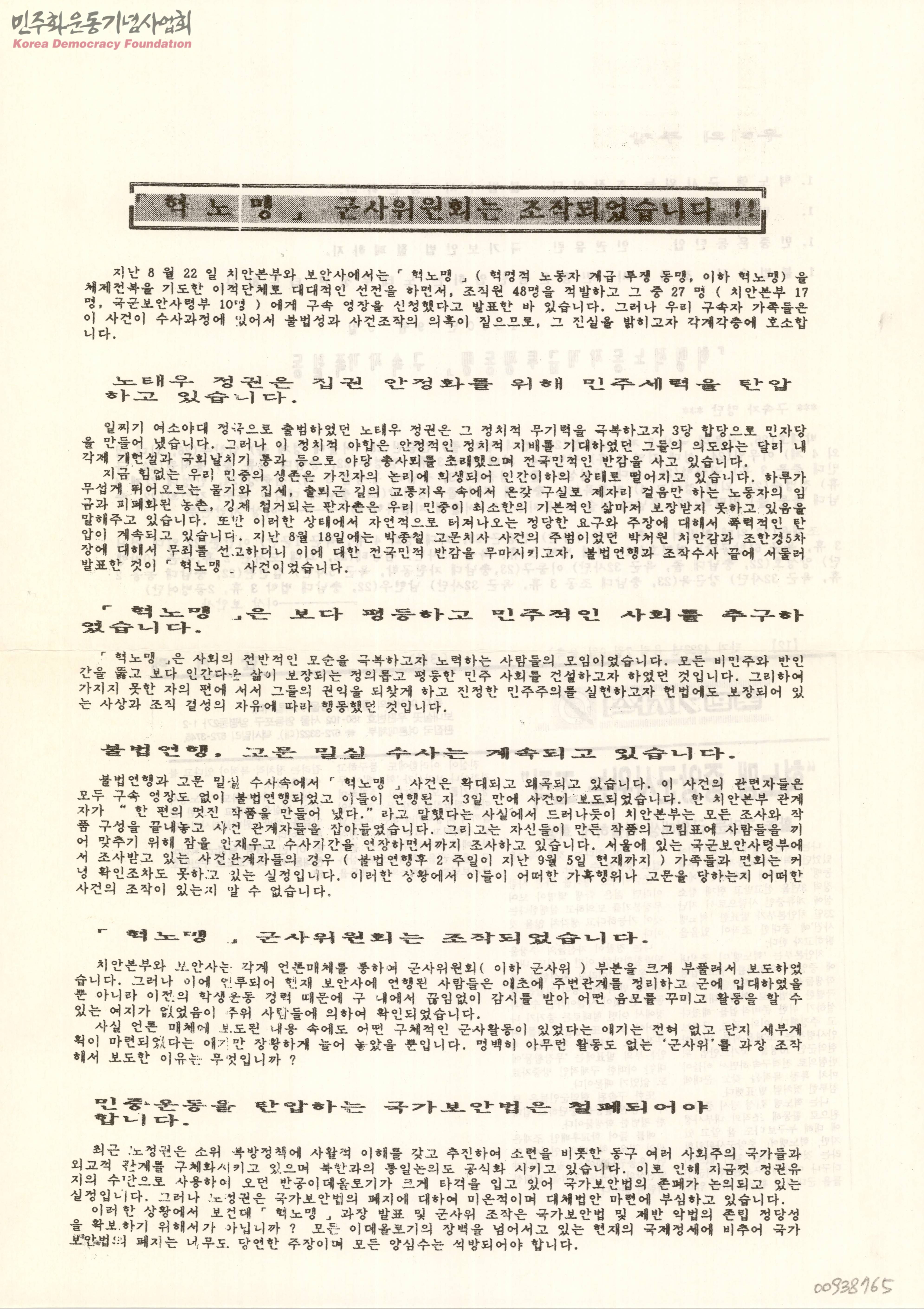 - 민중운동단체 혁노맹 조직원들에 대한 불법 연행과 고문 밀실수사에 대한 규탄, 군사위원회 조작 보도와 민중운동 탄압 국가보안법의 철폐를 주장하는 내용의 문서.