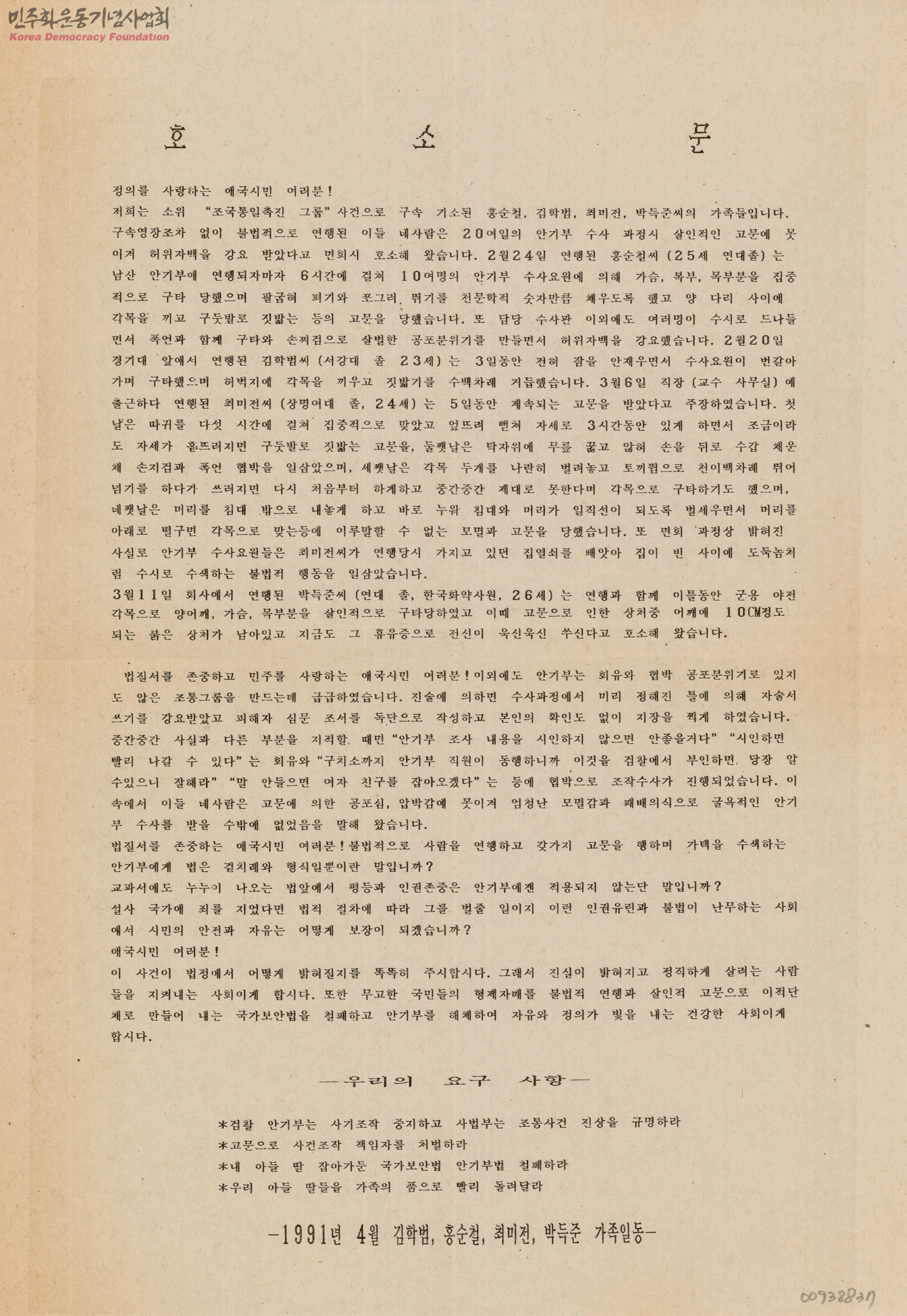 - 통일촉진 인권운동으로 구속 기소된 홍순철, 김학범, 최미전, 박득준의 무자비한 고문내용을 다룬 피해자 가족 호소문