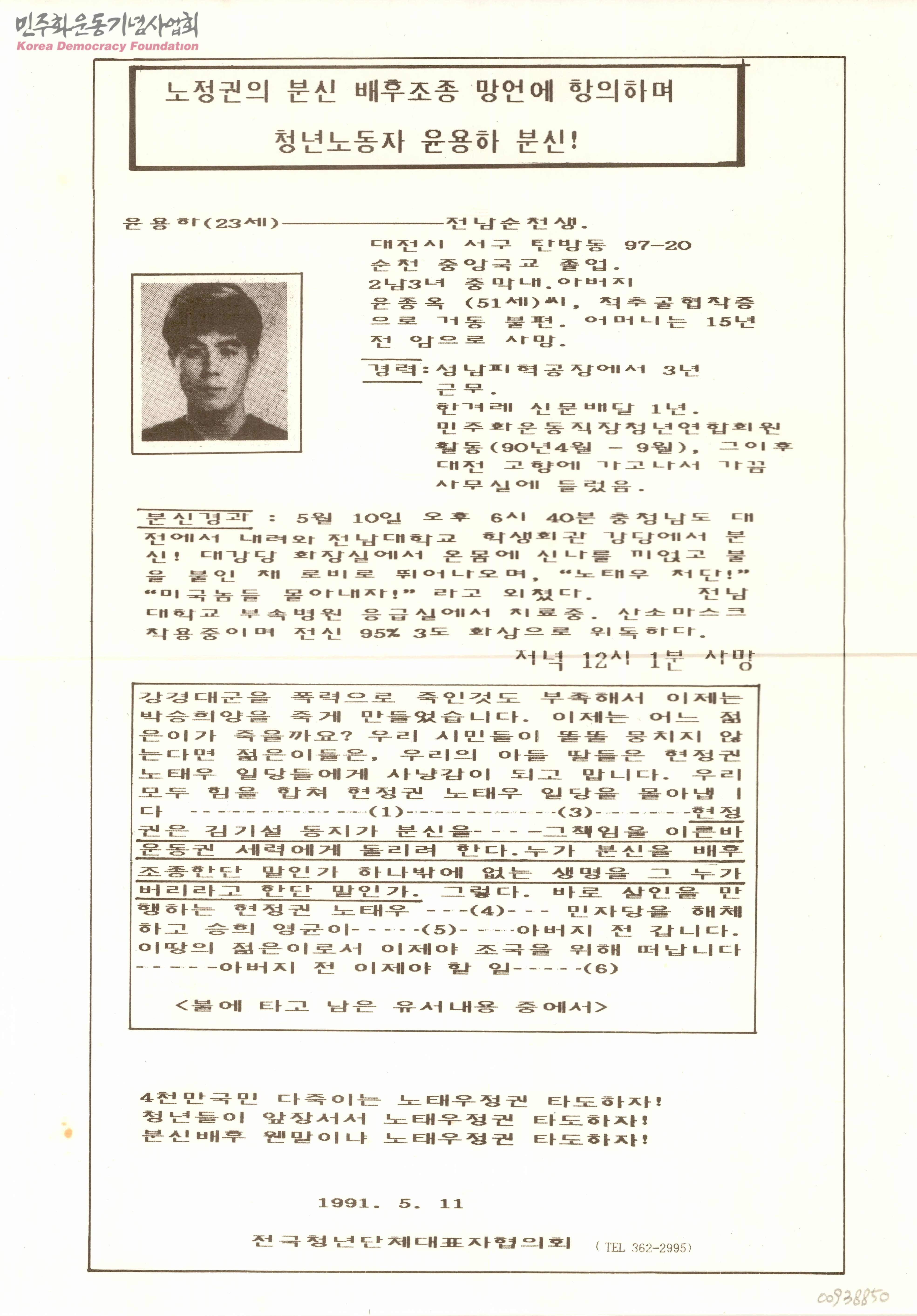 - 1991년 5월 10일 청년노동자 운용하의 인적사항과 노태우정권 타도를 위한 분신자살 사건 내용 및 불에타고 남은 유서 내용
