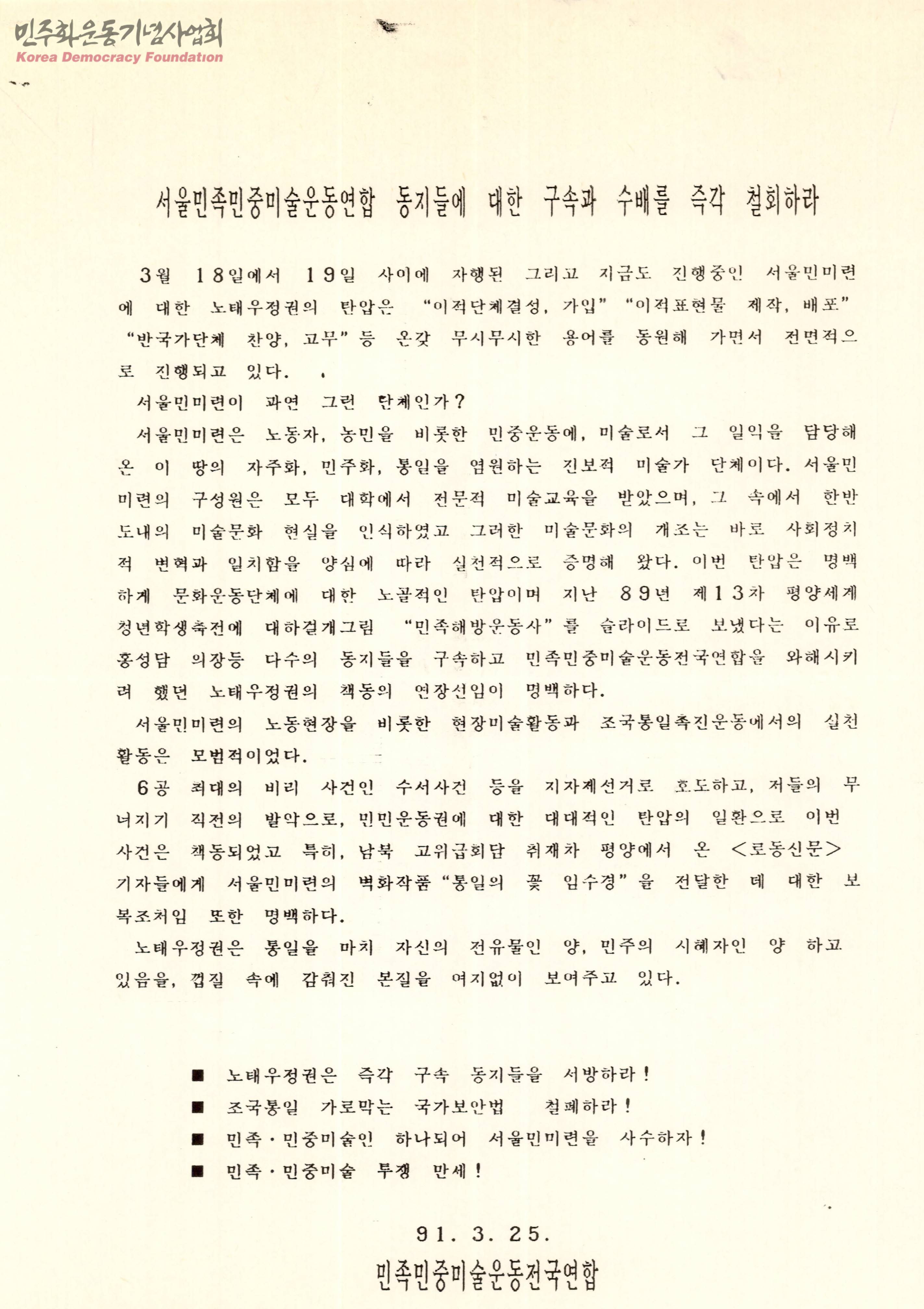서울민족민중미술운동연합 동지들에 대한 구속과 수배를 즉각 철회하라 , 호소문