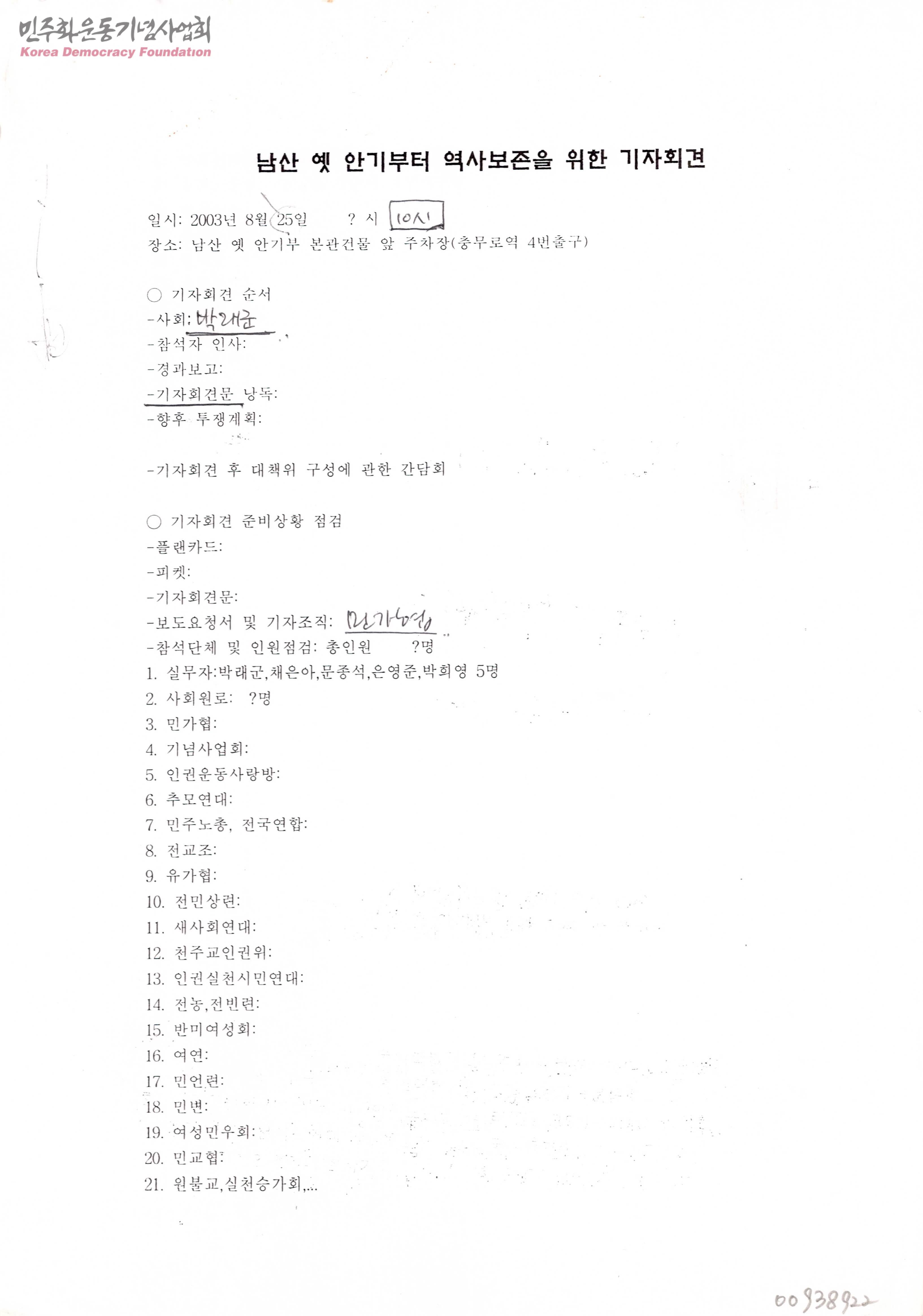 - 남산 옛 안기부 터를 인권기념공언으로 보존해야한다는 기자회견문 순서와 내용및 경과보고 내용, 현재 남아있는 옛 안기부 건물과 남산 내 옛 안기부 터 관련 진행 사항 내용 , 중앙정보부(1973~1980)및 안기부(1981~1995)의 주요사건 정리 내용