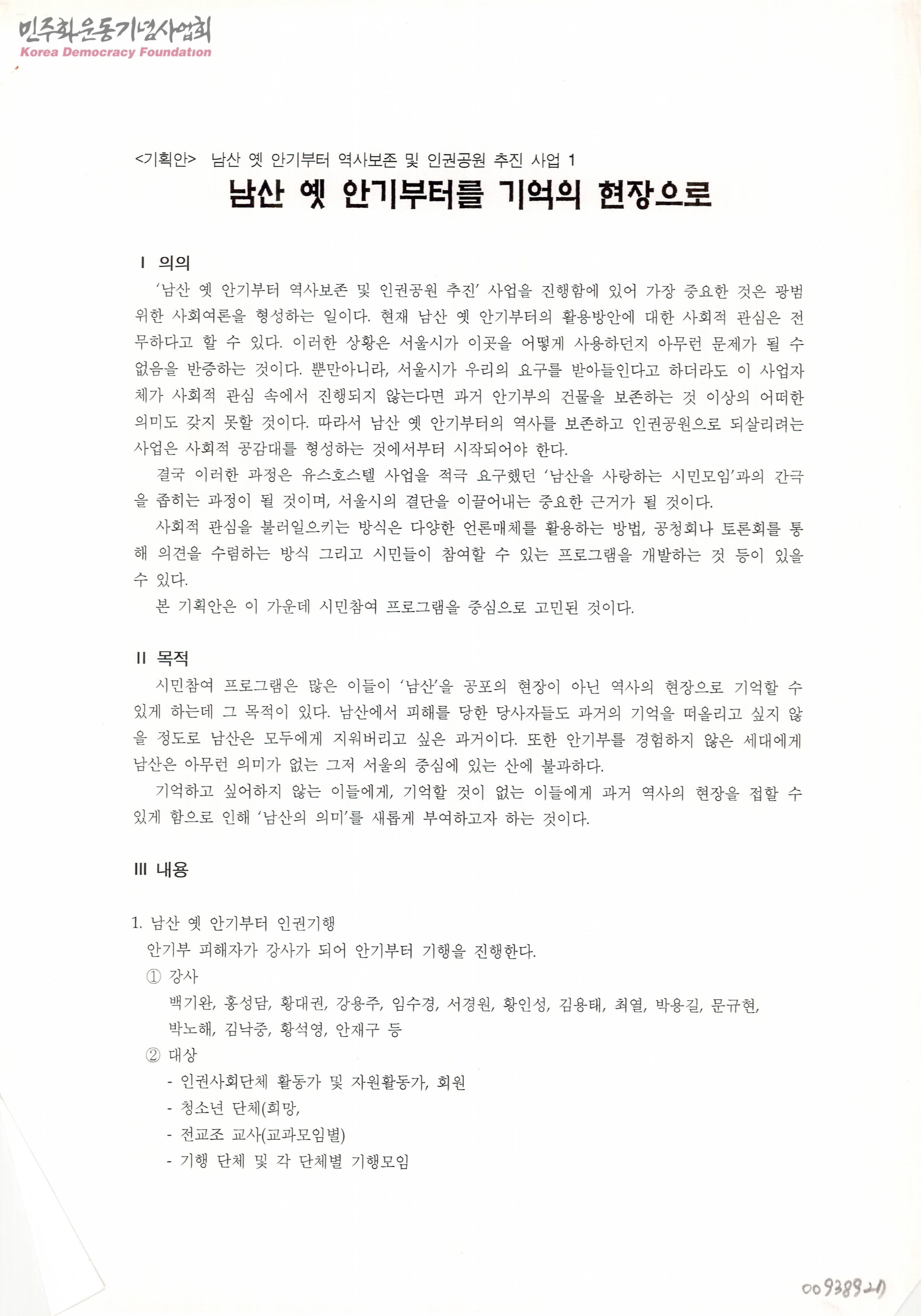 - 남산 옛 안기부 터 역사보존 및 인권공원 추진 사업의 의의와 목적, 관련 행사및 전시회와 일정에 대한 내용