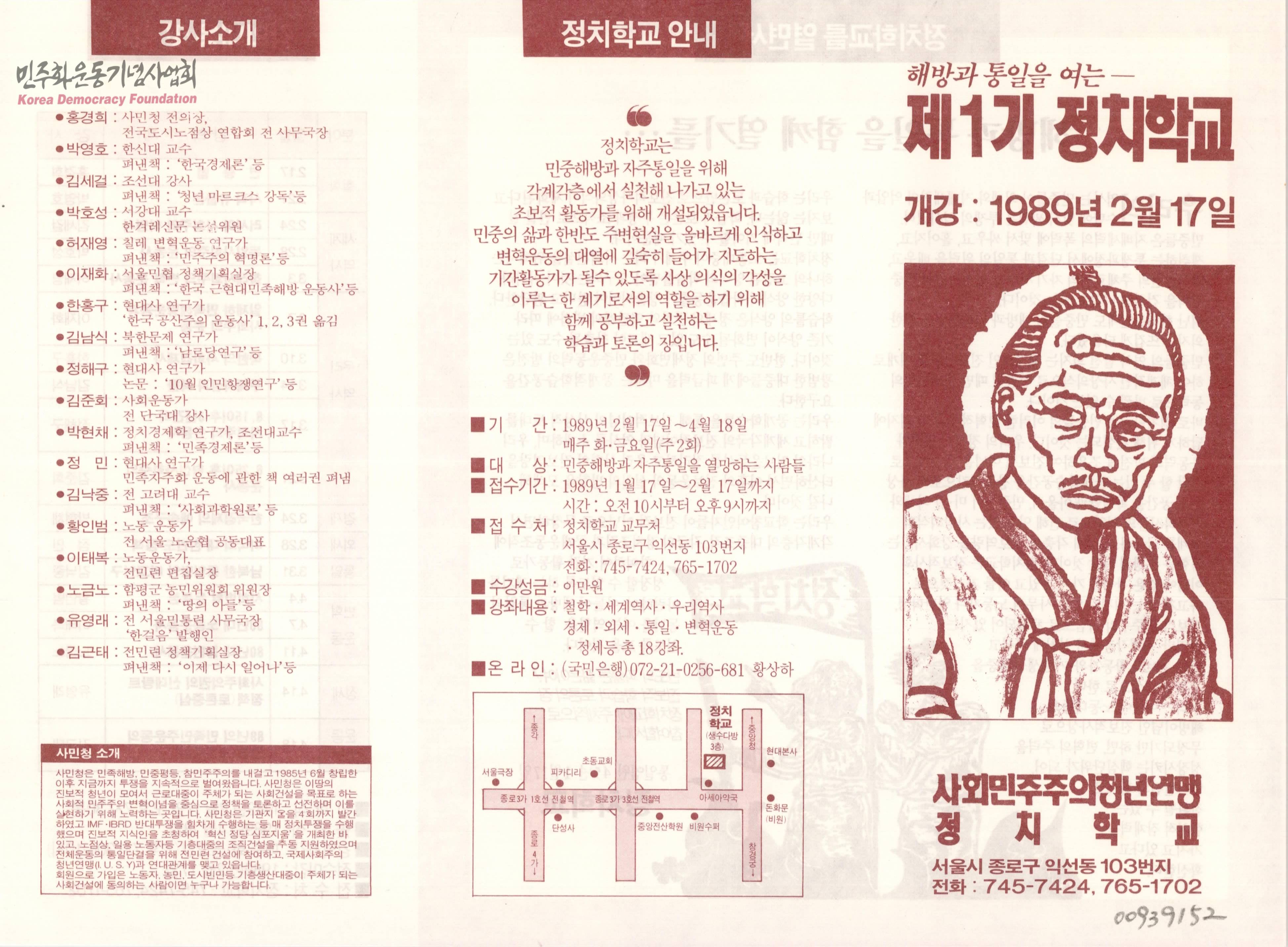 - 정치학교의 안내 및 강의내용과 강사에 대한 설명과 정치학교를 열면서 쓴 다짐이 적힌 리플릿