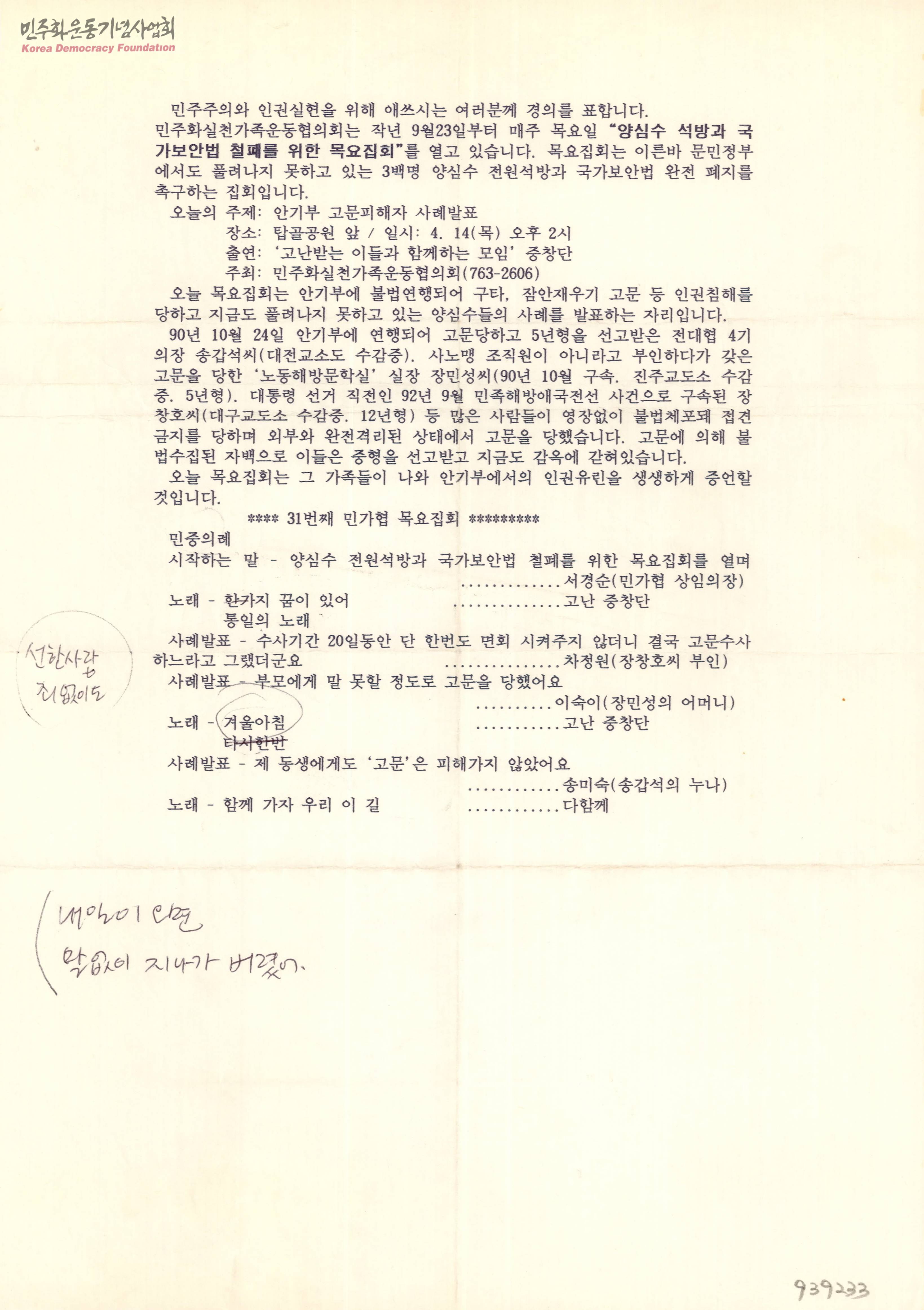 - 양심수 석방과 국가보안법 철폐를 위한 목요집회에 대한 설명과 안기부 고문피해자 사례의 발표 및 31번째 민가협 목요집회의 순서에 대한 내용이 적힌 문서