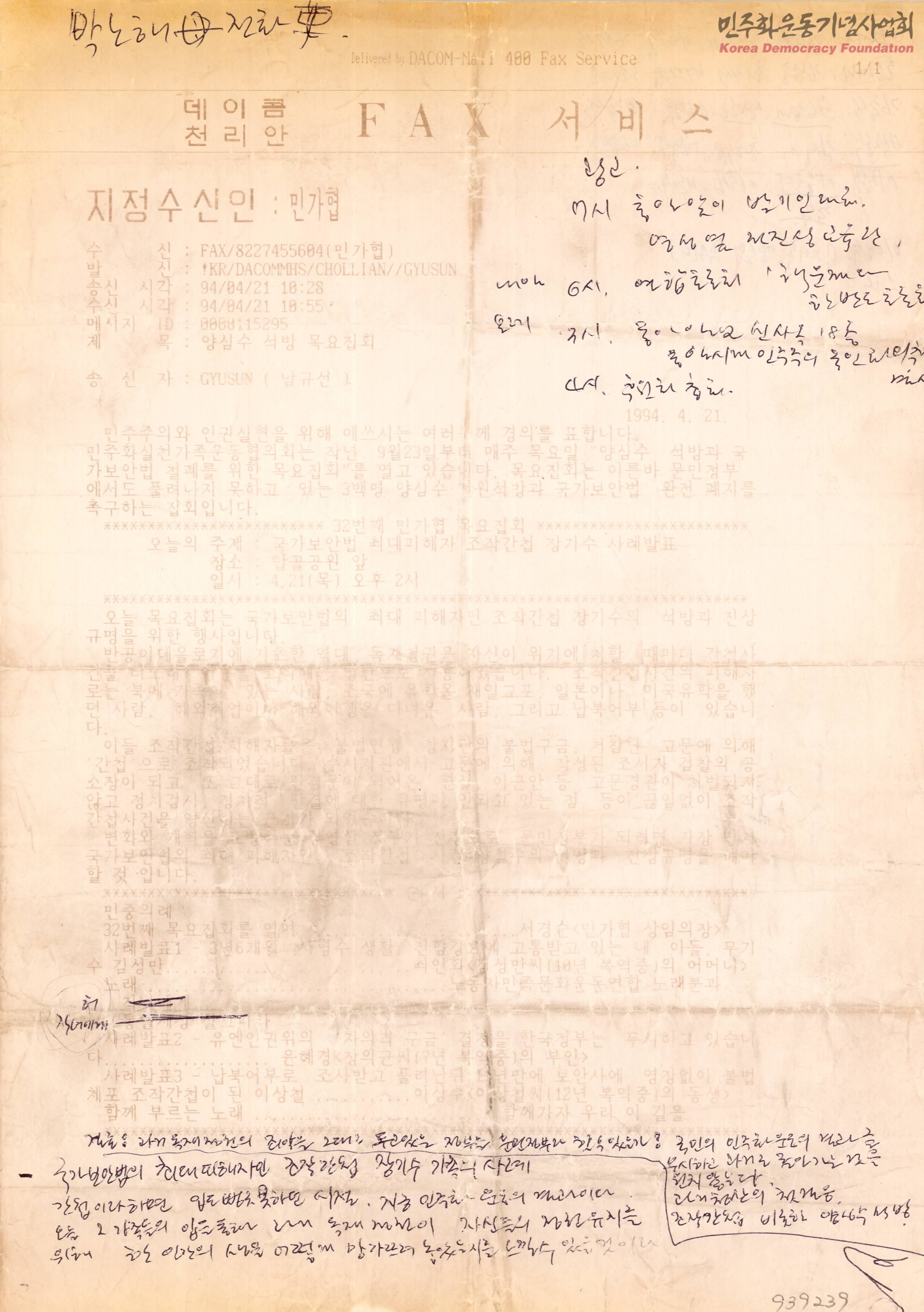 - 목요집회에 대한 설명과 국가보안법 최대피해자 조작간첩 장기수 사례발표에 관한 내용 및 집회의 순서가 적힌 문서