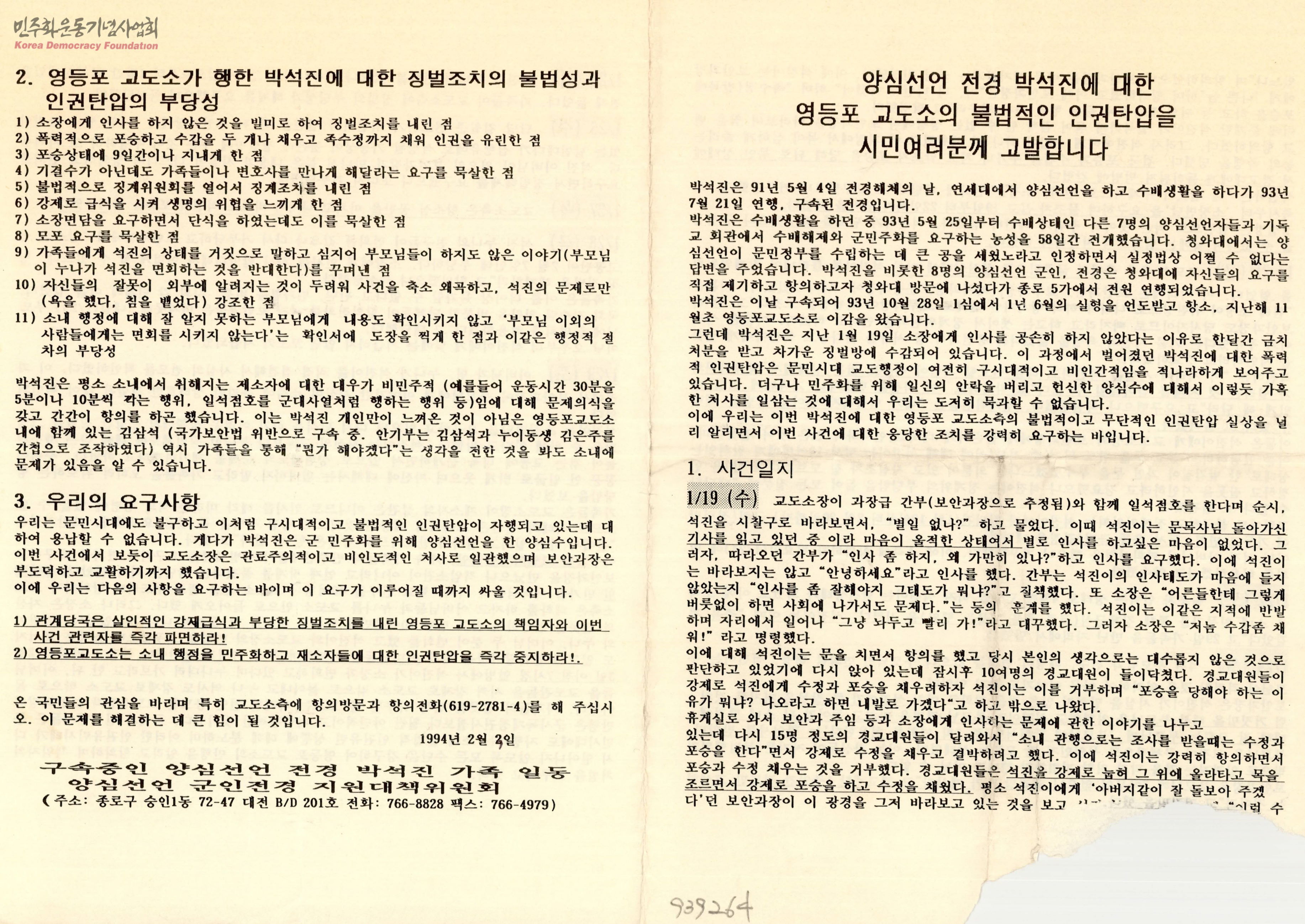 - 박석진이 교도소 내에서 겪은 일자별 사건의 진행내용과 영등포교도소가 행한 박석진에 대한 징벌조치의 불법성과 인권탑압의 부당성의 내용 및 책임자와 관리자를 파면하고 인권탄압을 중지하라는 요구사항이 담긴 문서