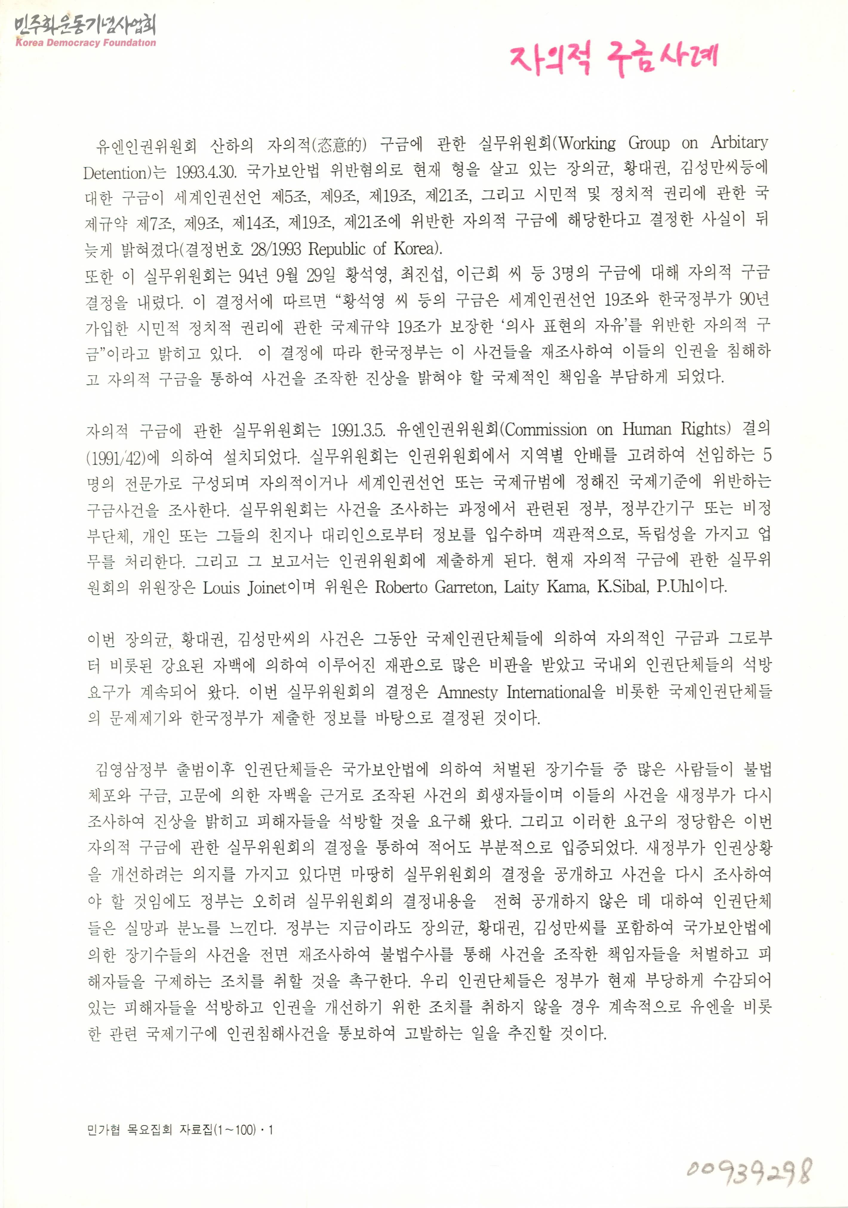 - 유엔인권위원회는 국가보안법 위반혐의로 형을 살고 있는 장의균, 황대권, 김성만 등에 대한 구금이 세계인권선언 및 정치적 권리에 관한 국제규약에 위반한 자의적 구금이라고 말하는 글과, 위 3인의 가족들이 쓴 글들, 그리고 최진섭 어머니의 편지가 모여있는 글