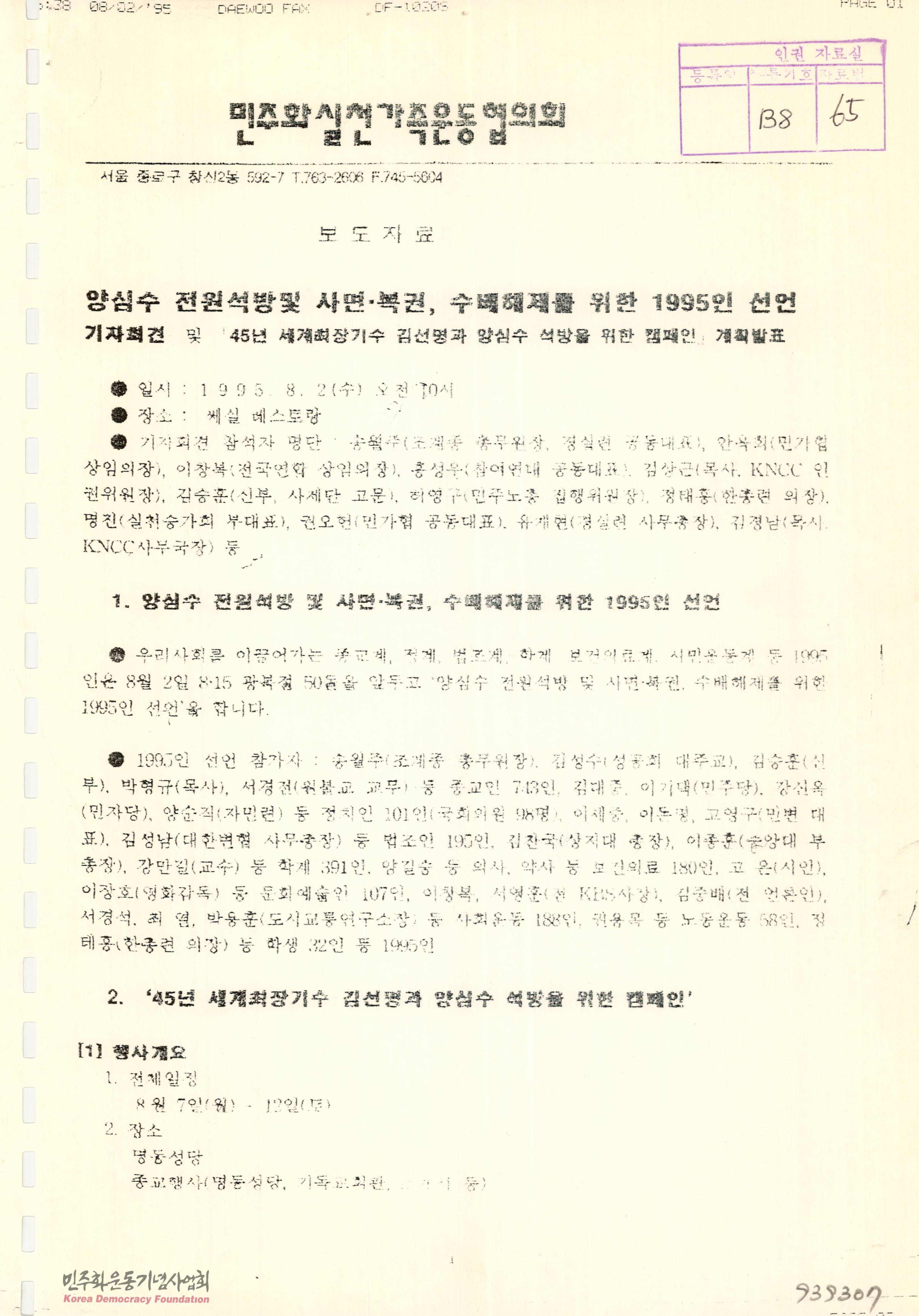 - 1995인은 8월 2일 8·15 광복절 50돌을 앞두고 선언을 할 것이며, 관련 캠페인은 8월 7일부터 12일까지 명동성당에서 진행되며 감옥체험, 하루단식 등의 행사가 포함되어 있다는 내용의 보도자료