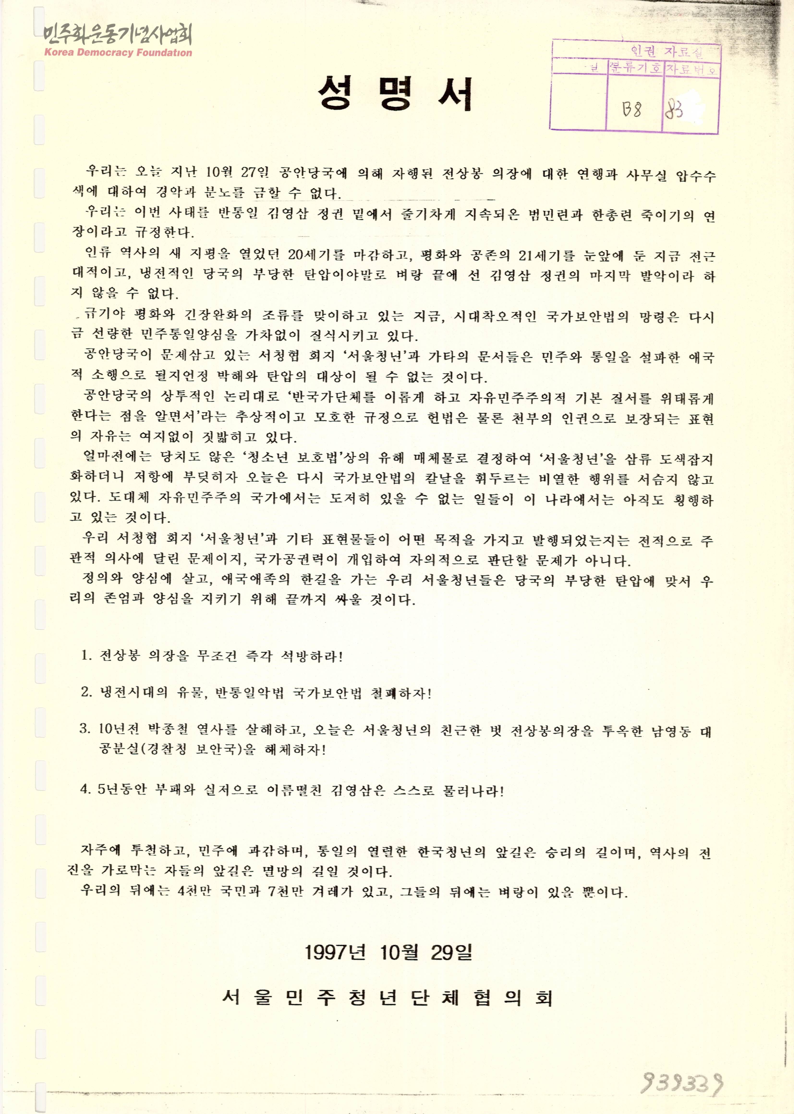 - 전상봉 의장을 즉각 석방, 국가보안법 철폐, 남영동 대공분실 해체, 김영삼 퇴진을 주장하는 글