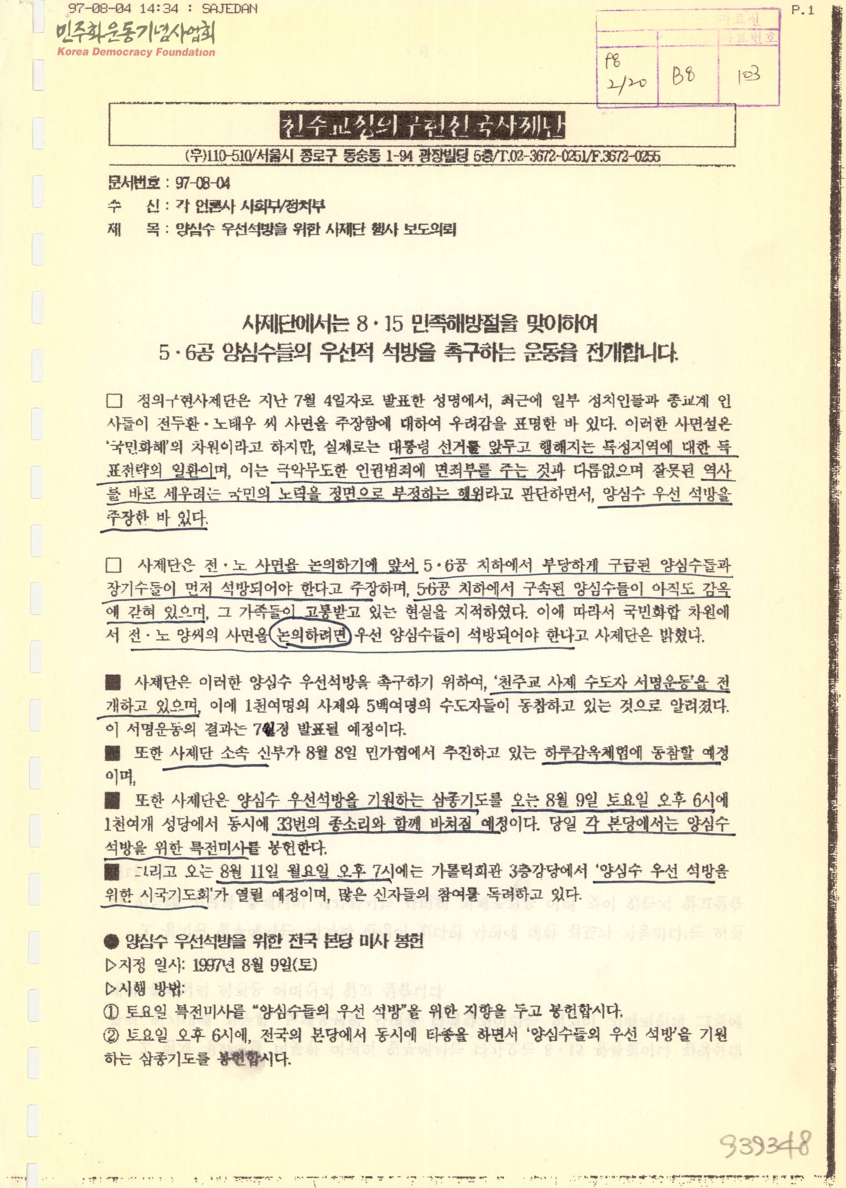 - 사제단에서 8·15 민족해방절을 맞이하여 5·6공 양심수들의 우선적 석방을 촉구하는 운동을 전개한다는 내용으로, 양심수 우선석방을 위한 전국 본당 미사 봉헌, 양심수 우선석방을 위한 시국기도회, 양심수 우선석방을 위한 천주교 사제 수도자 서명운동 등의 활동을 실시한다는 글