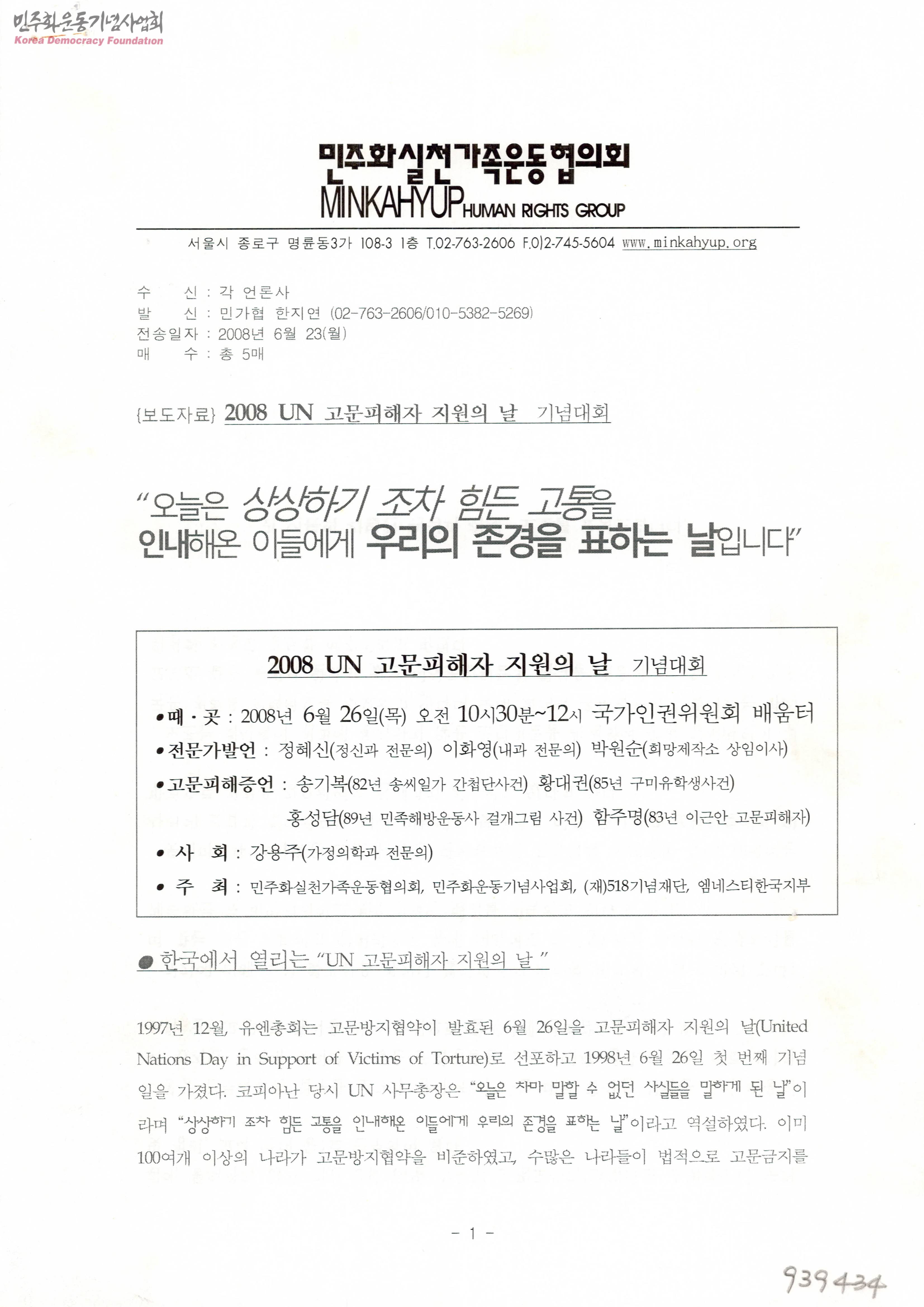 [보도자료] 2008 UN 고문피해자 지원의 날 기념대회
