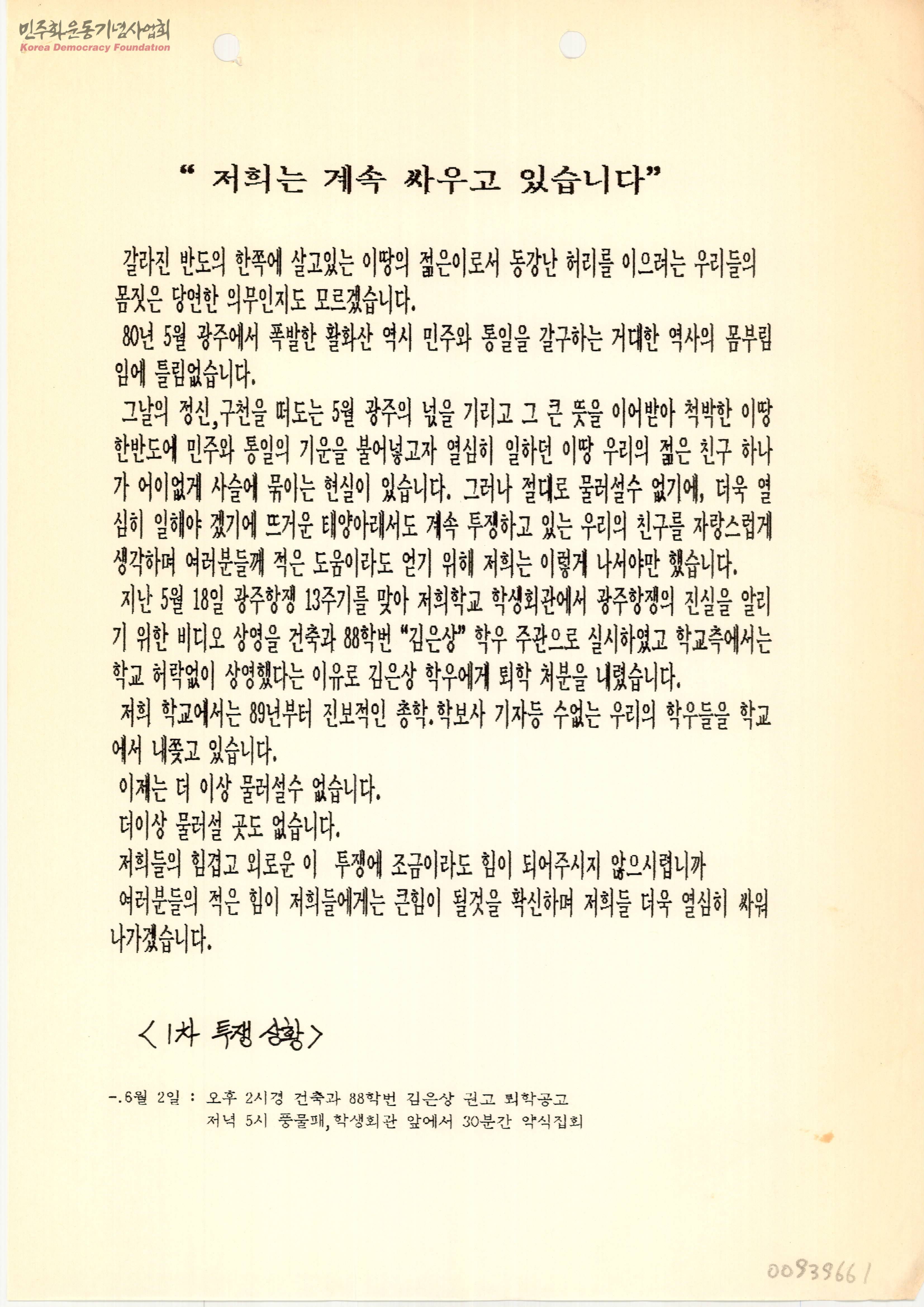 - 광주항쟁 13주기를 맞아 건축과 88학번 김은상이 학생회관에서 비디오를 상영하고 학교측은 허락없이 상영되었기 때문에 퇴학처분을 하였으며 이에대해 6월 2일부터 7월 22일까지의 투쟁일지를 작성한 문서