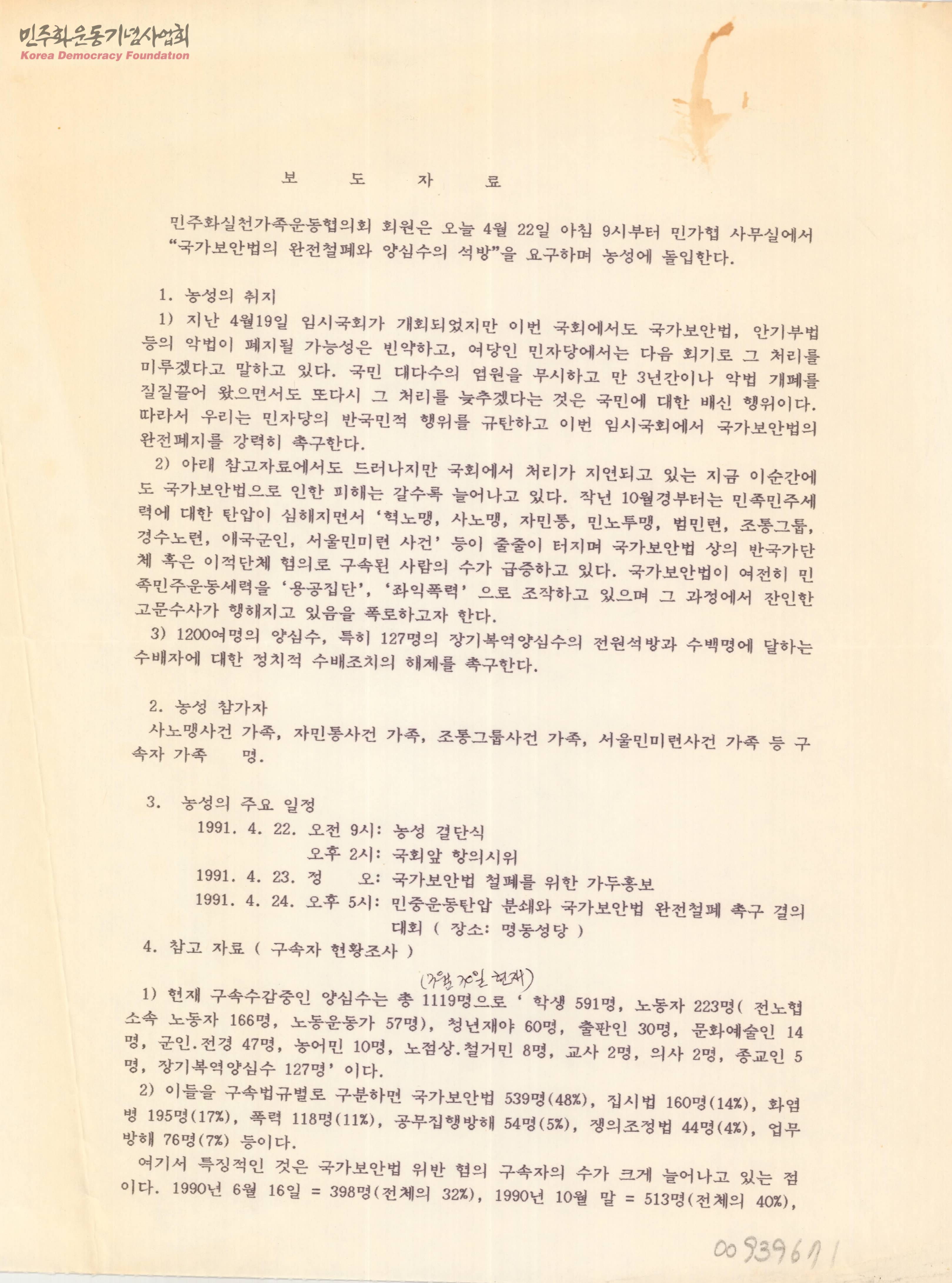 - 민가협 회원들의 국가보안법 철폐와 양심수 석방 농성 시작을 알리고 농성의 취지와 주요 일정등을 설명하는 보도자료.