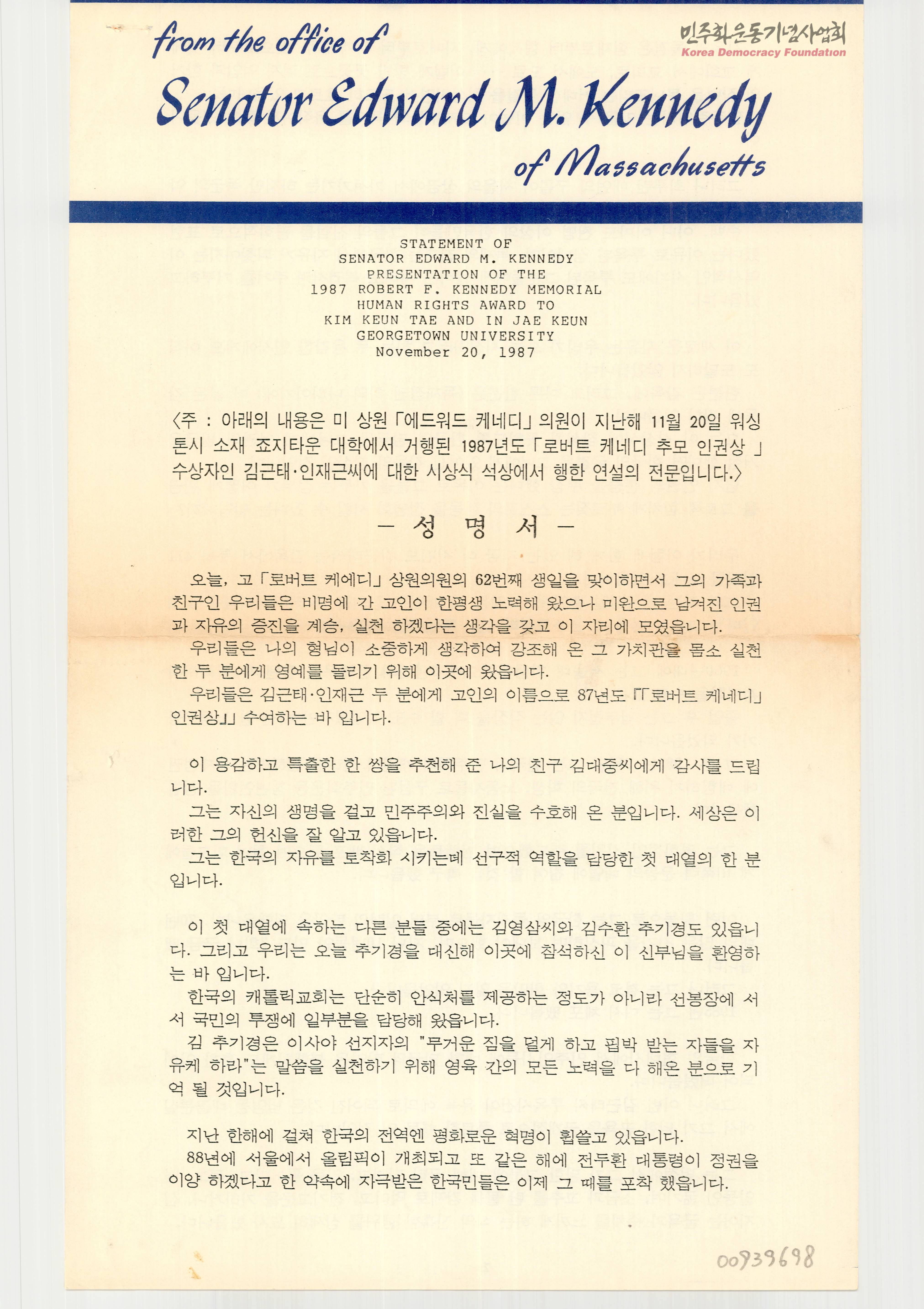 - 독재정권에 대항한 민주화운동으로 구속된 양심수 김근태와 인재근씨에게 로버트 케네디 인권상을 시상하며 발표한 성명문.
