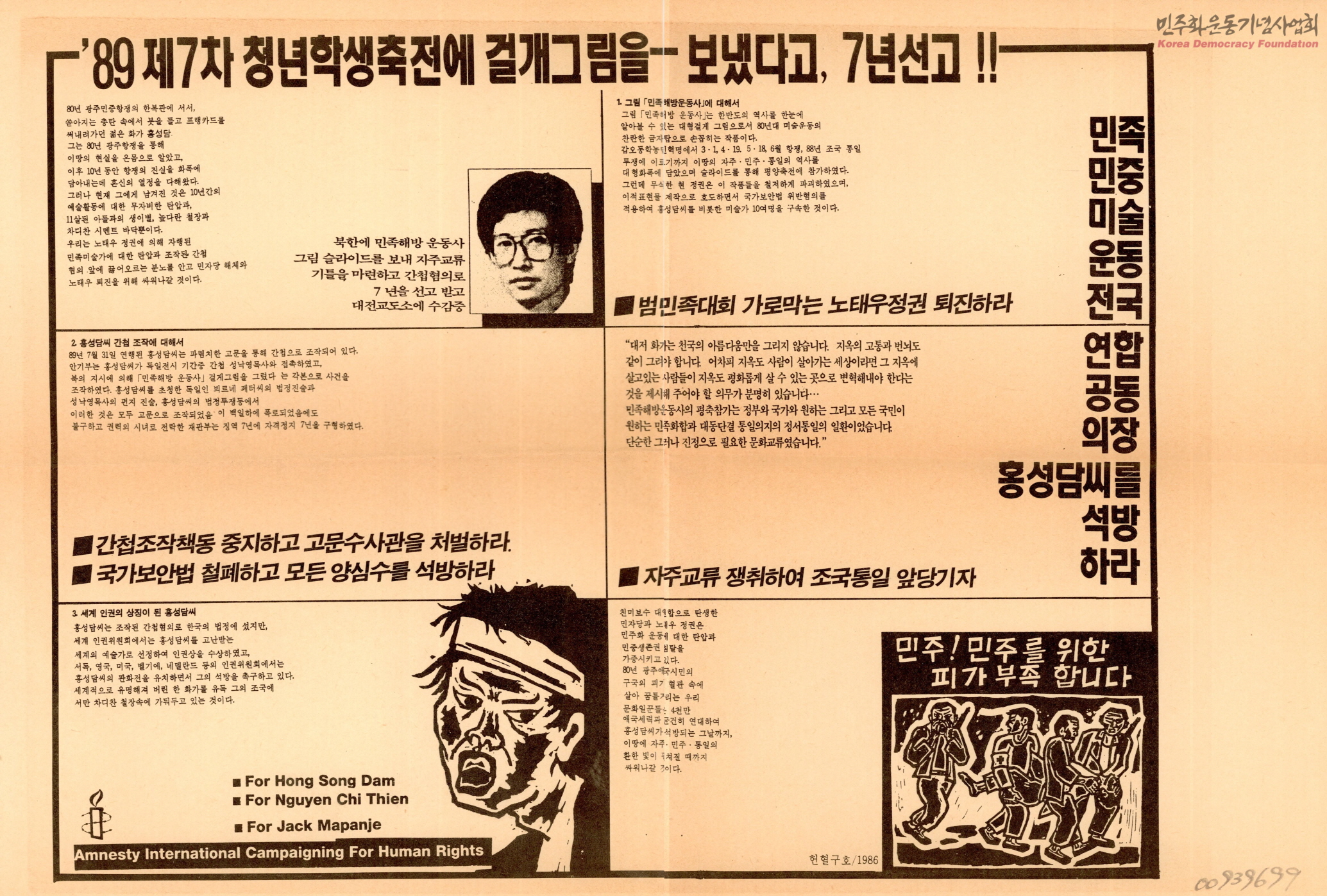 - 간첩혐의로 수감중인 홍성담씨의 사건에 관한 설명과 함께 석방을 요구하며 국가보안법 철폐와 양심수의 석방을 주장하는 내용의 공고문.