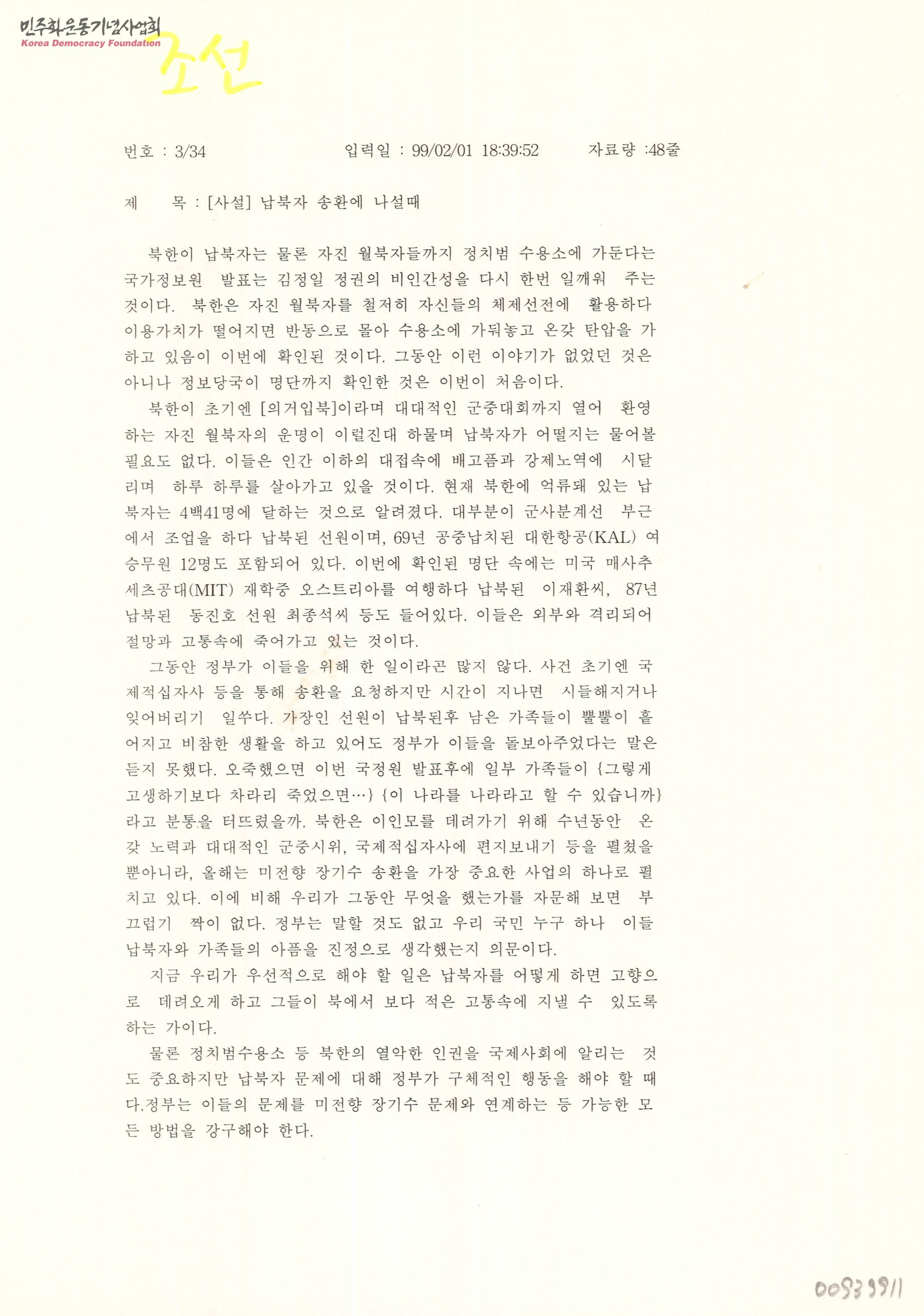 - 99년 2월 당시 납북자는 441명이었는데 국제사회와 연대하는 것도 중요하지만 납북자 송환을 미전향 장기수 문제와 연계하여 해결하는 등 정부의 구체적인 행동을 촉구하는 글
