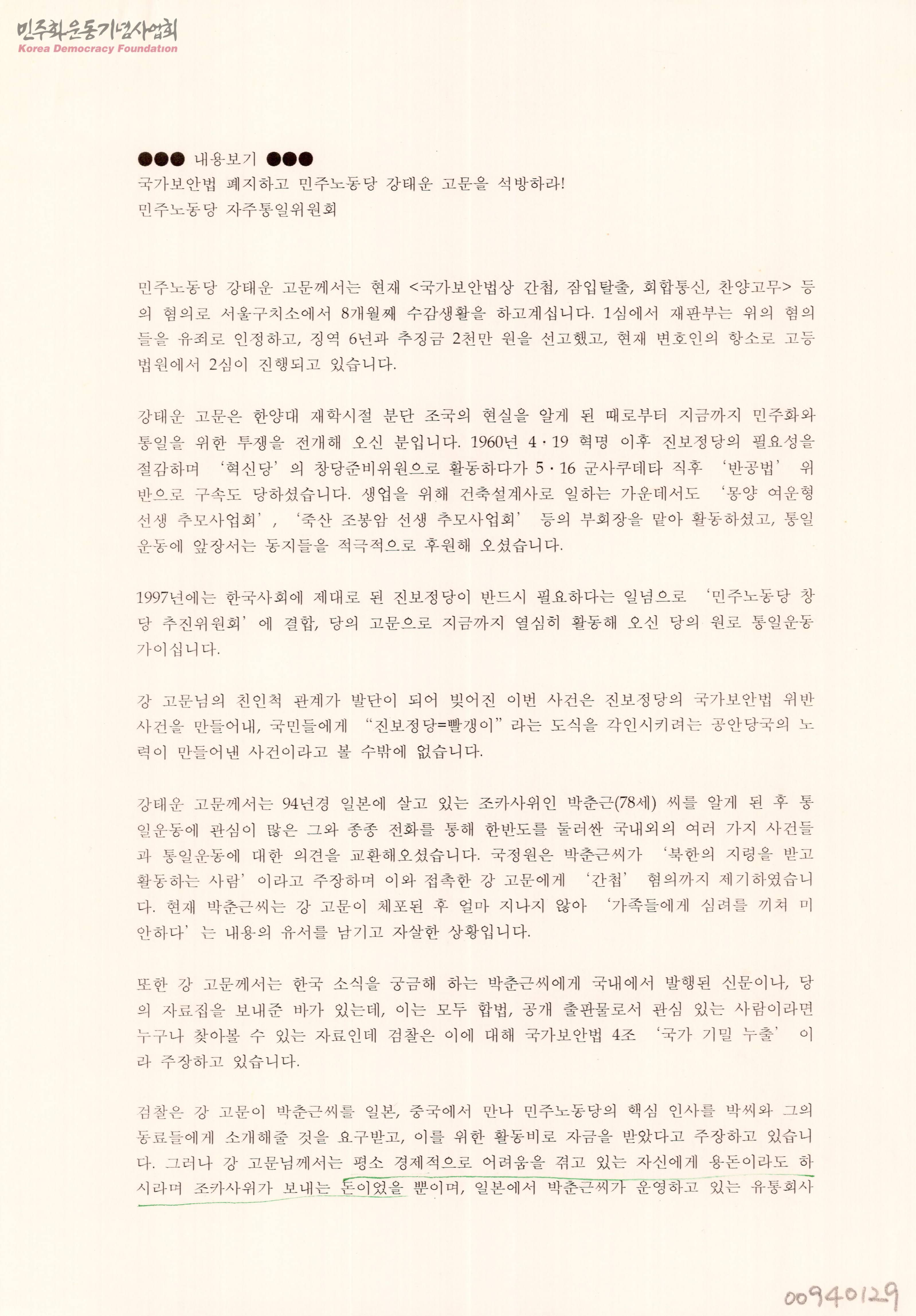 - 국가보안법 위반 혐의로 구속된 강태운의 무죄판결과 조속한 석방, 국가보안법 폐지를 주장하는 호소문