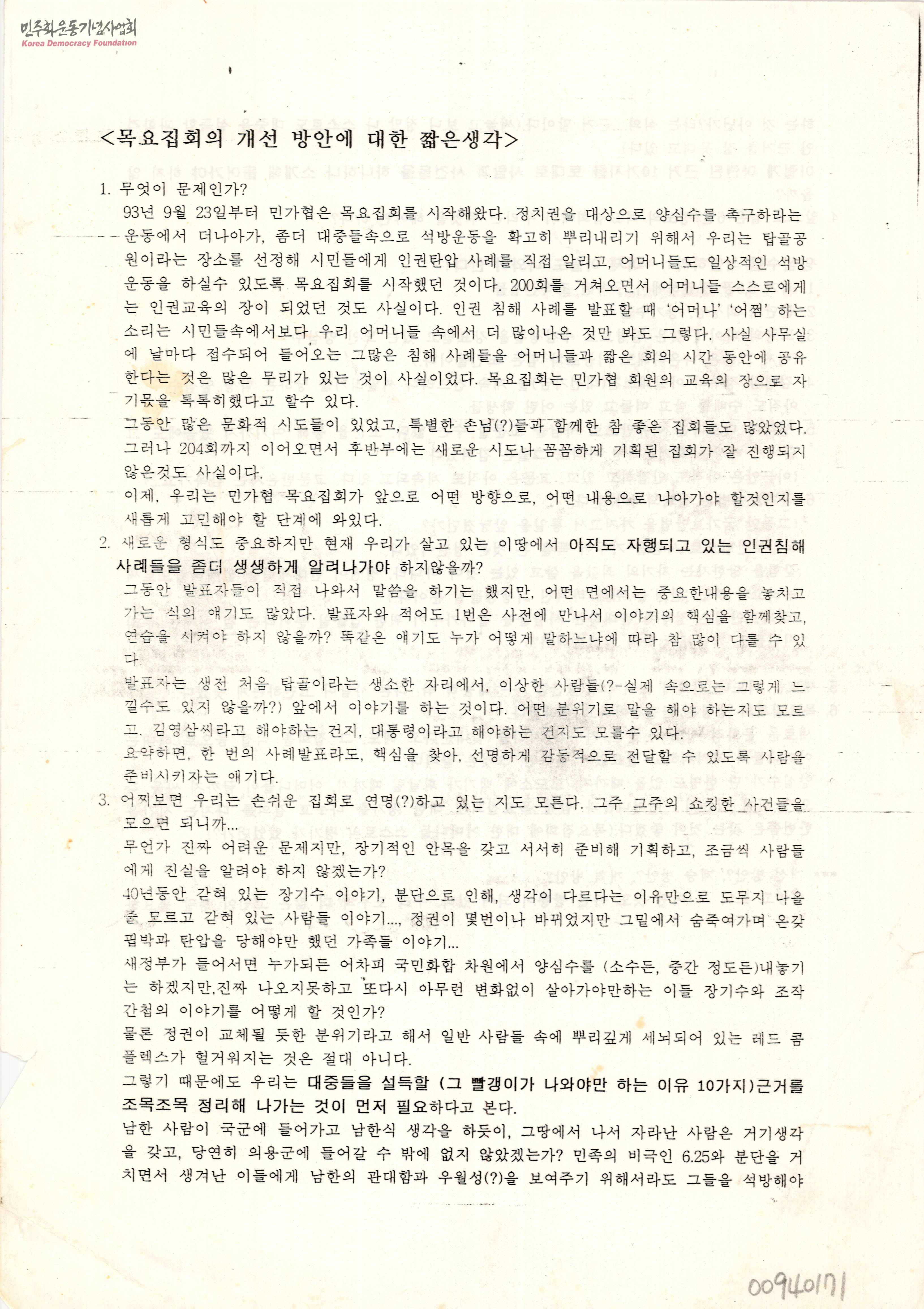 - 정치권을 대상으로 양심수를 촉구하라는 운동으로 과거 5,6공 정권하에서 구속된 조작간첩들, 장기수들, 노인 양심수, 김영삼정부의 대선자금을 건드리다 수배당한 학생 양심수 등 시민들에게 인권탄압 사례를 알리고 새로운 시도나 기획으로 개선할 수 있도록 고민하자는 내용의 글