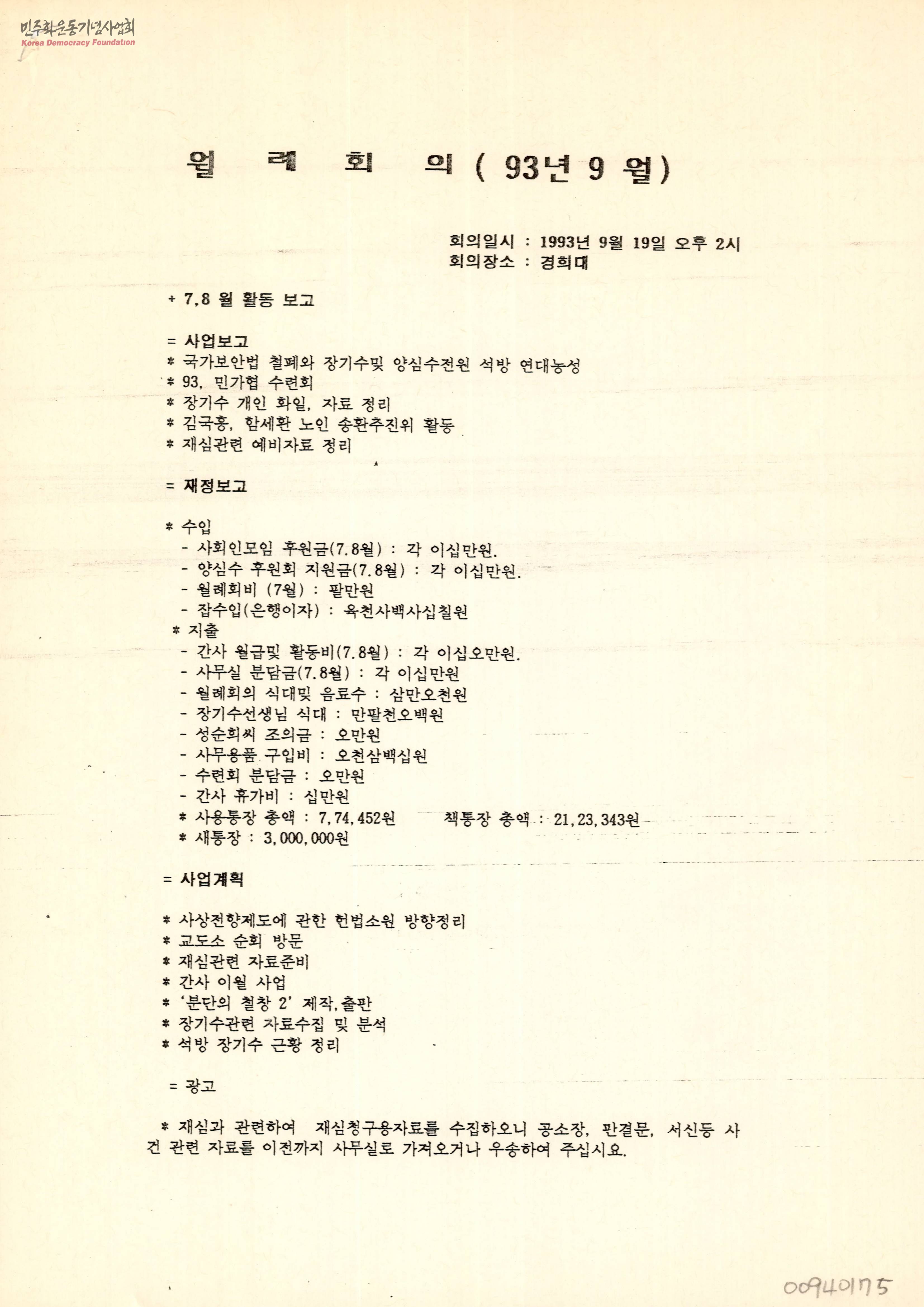 - 국가보안법 철폐와 장기수 전원 석방 연대농성 및 수련회, 재심관련 예비자료 정리 등의 활동보고와 재정보고, 향후 사업계획에 대해 논의한 회의록