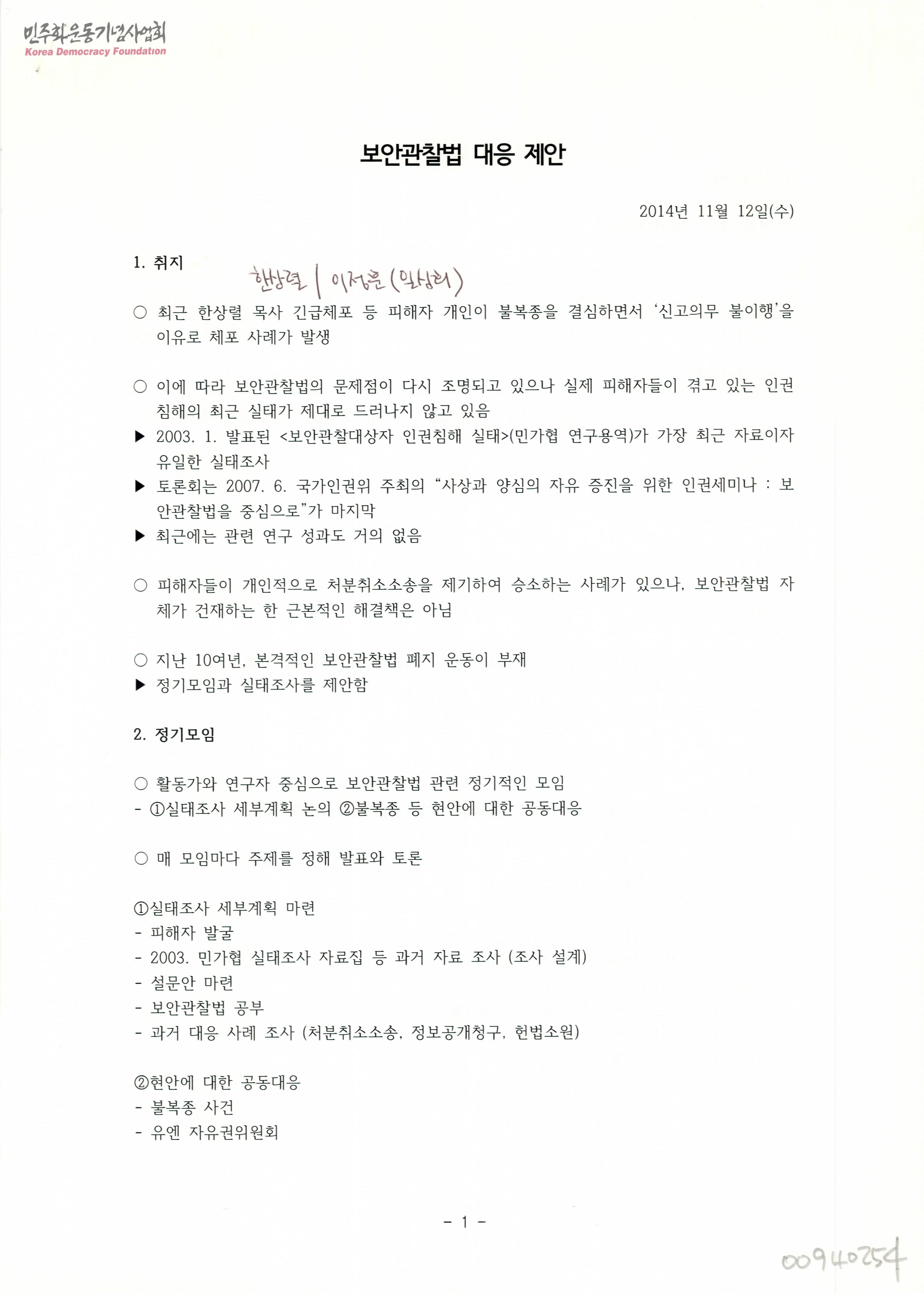 - 한상렬 목사 긴급체포 등 피해자 개인이 불복종을 결심하면서 '신고의무 불이행'을 이유로 체포사례가 발생하자 보안관찰법의 문제점이 다시 조명되고 있으나 실제 피해자들이 겪고 있는 인권 침해의 최근 실태는 제대로 드러나지 않고 있었고 지난 10여년, 보안관찰법 폐지 운동이 부재 하였기에 정기모임과 실태조사를 실시하여 보안관찰법의 인권침해 행태에 대응하고자 하는 취지에서 작성된 문서