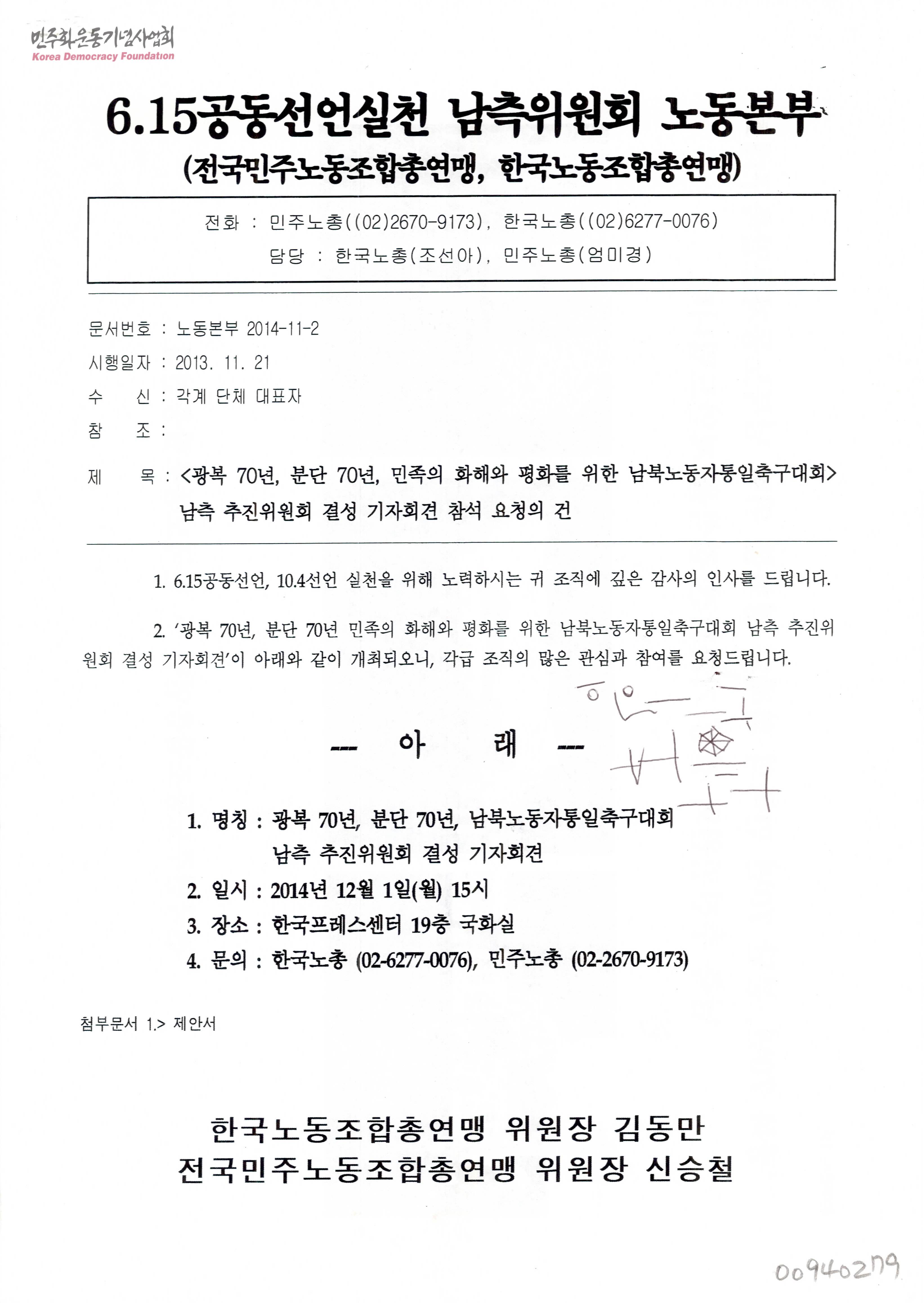 - 광복과 분단 70주기를 맞아 민족의 화해와 평화를 위해 남북노동자들 간에 통일축구대회를 조직하여 추진하기위해 남측 추진위원회 결성 기자회견 참석을 요청하는 제안서