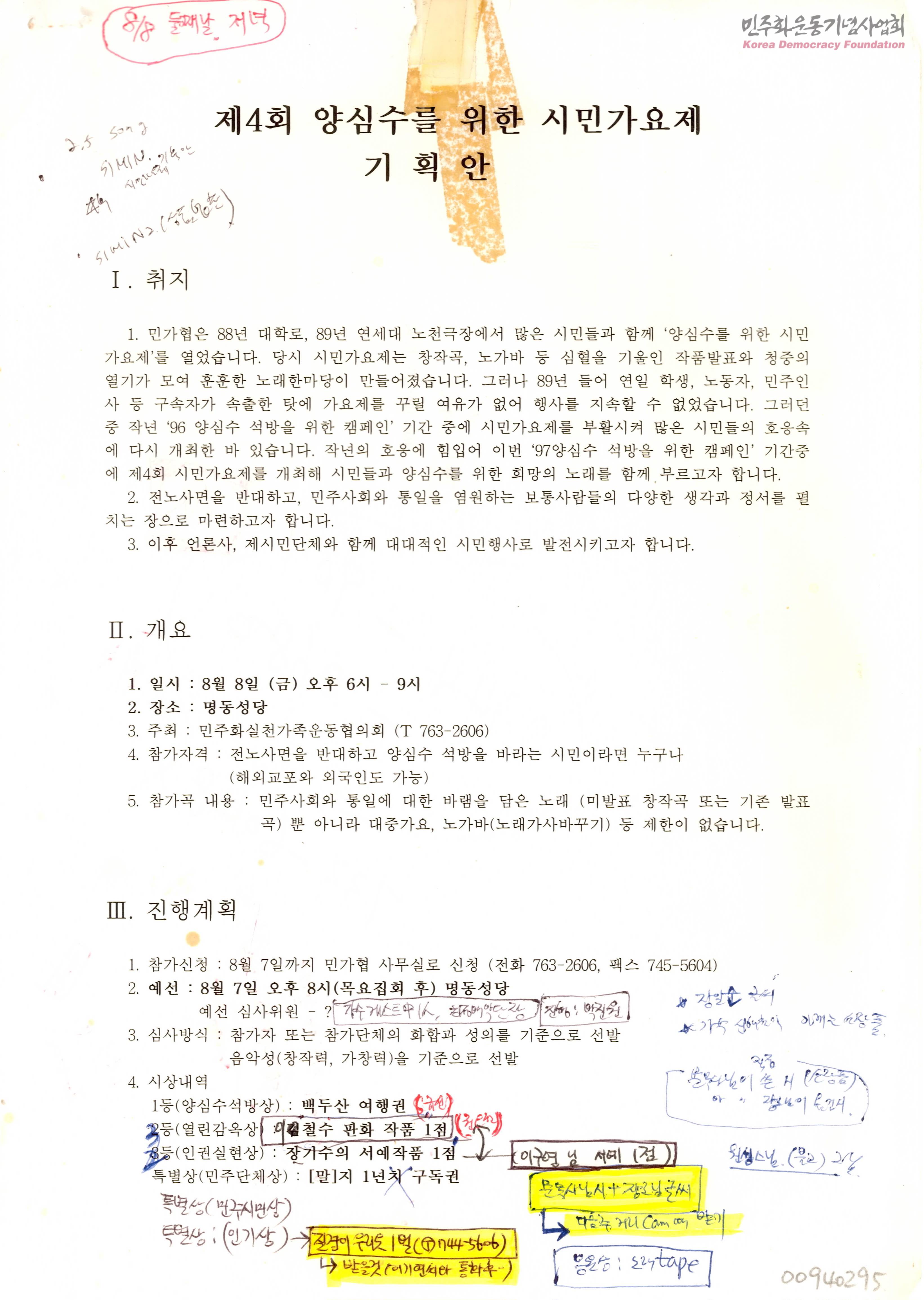 - 민가협이 주최하는 제4회 양심수를 위한 시민가요제의 기획안으로 행사 취지, 개요, 진행계획, 가요제 프로그램 등의 세부 정보를 정리한 문서