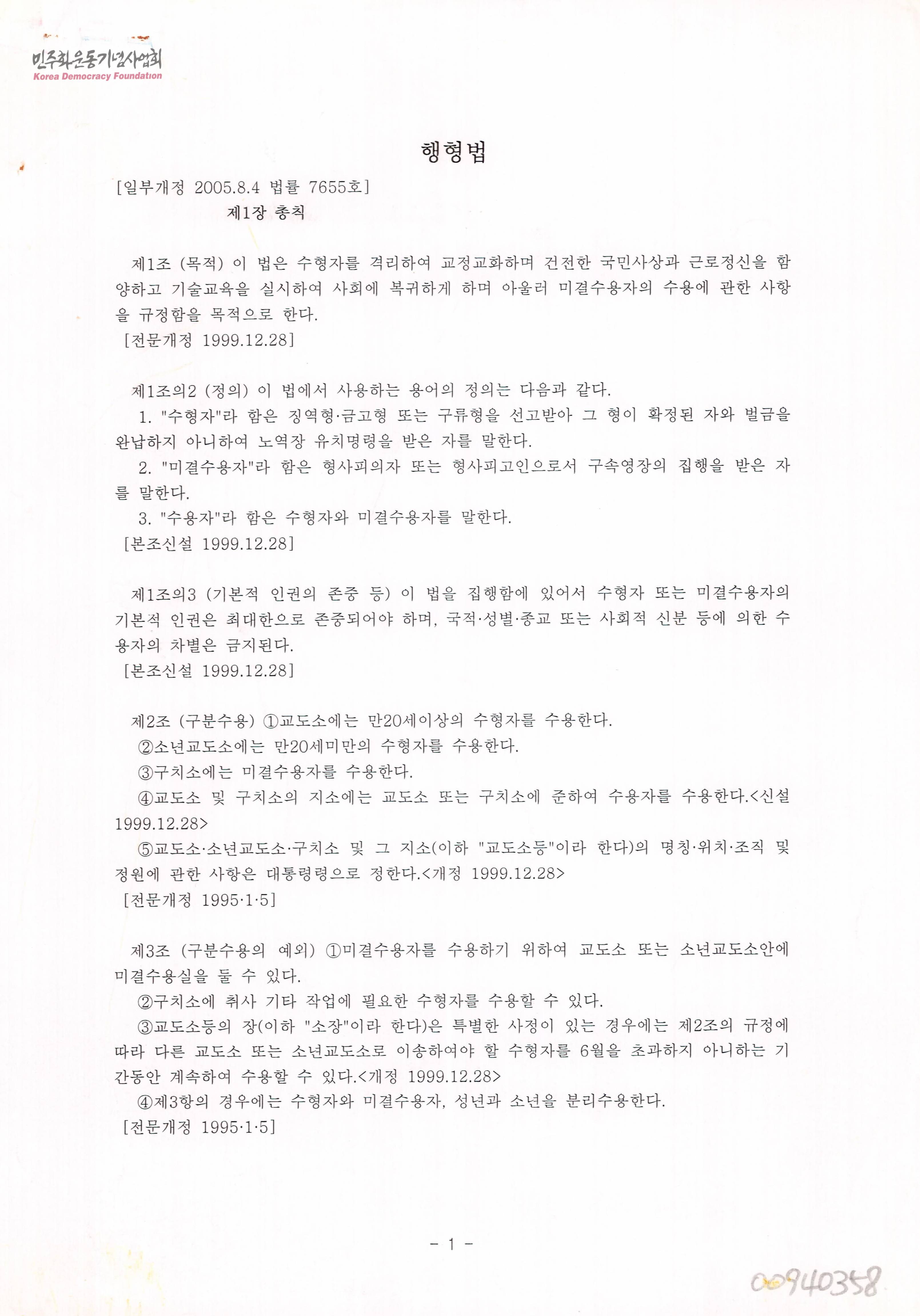 - 수형자를 격리하여 교정교화하며 건전한 국민사상과 근로정신을 함양하고 기술교육을 실시하여 사회에 복귀하게 하며 아울러 미결수용자의 수용에 관한 사항을 규정한 「행형법」 일부개정안 문서