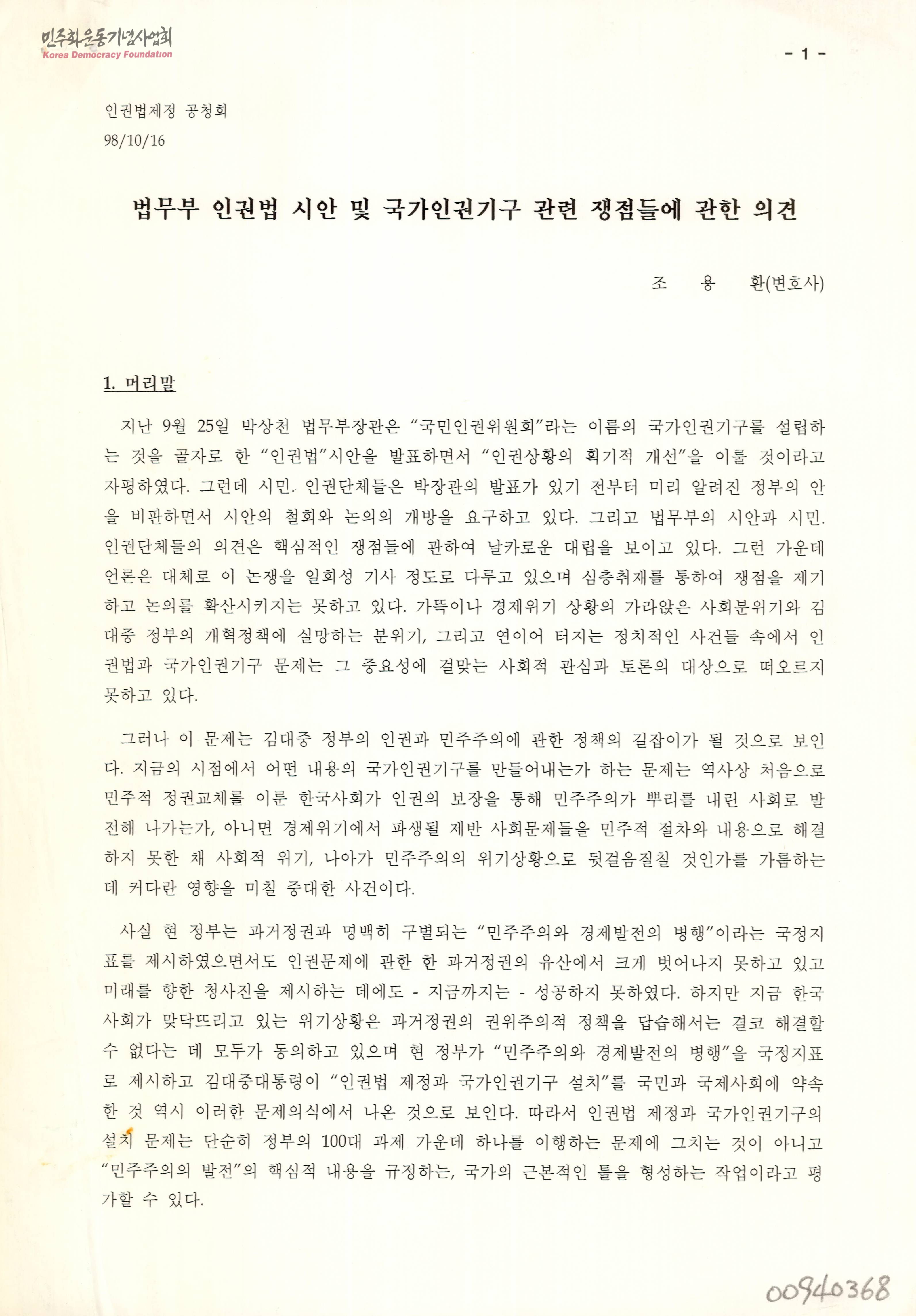 - 국가인권기구 관련된 사항들에 대한 의견문으로 이 사항이 김대중 정부의 인권과 민주주의에 관한 정책의 길잡이로 보고 있으며 현 정부는 민주주의를 표방했음에도 인권문제에 대해서는 과거정권의 유산에 크게 벗어나지 못하고 있다고 비판하는 내용이며 법무부가 인권법을 만들려는 것은 이례적이고 어색하다는 등 인권법 제정에 대해 비판하는 내용