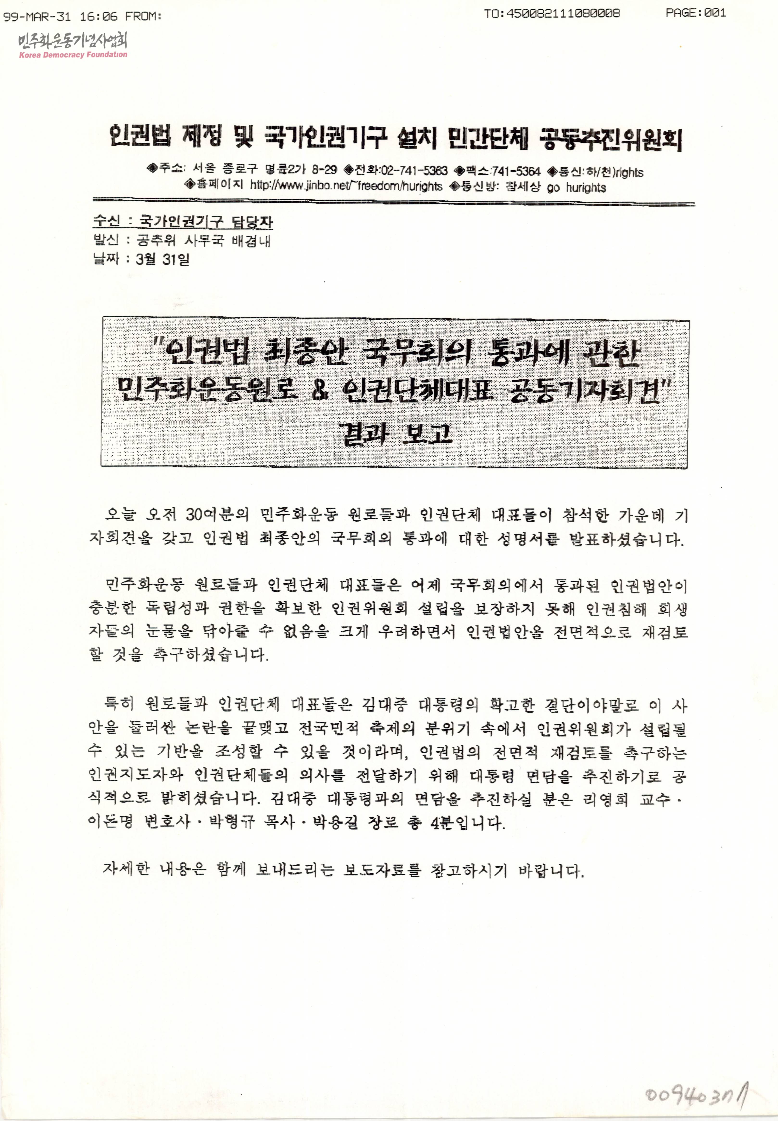 "인권법 최종안 국무회의 통과에 관한 민주화운동원로 & 인권단체대표 공동기자회견" 결과 보고