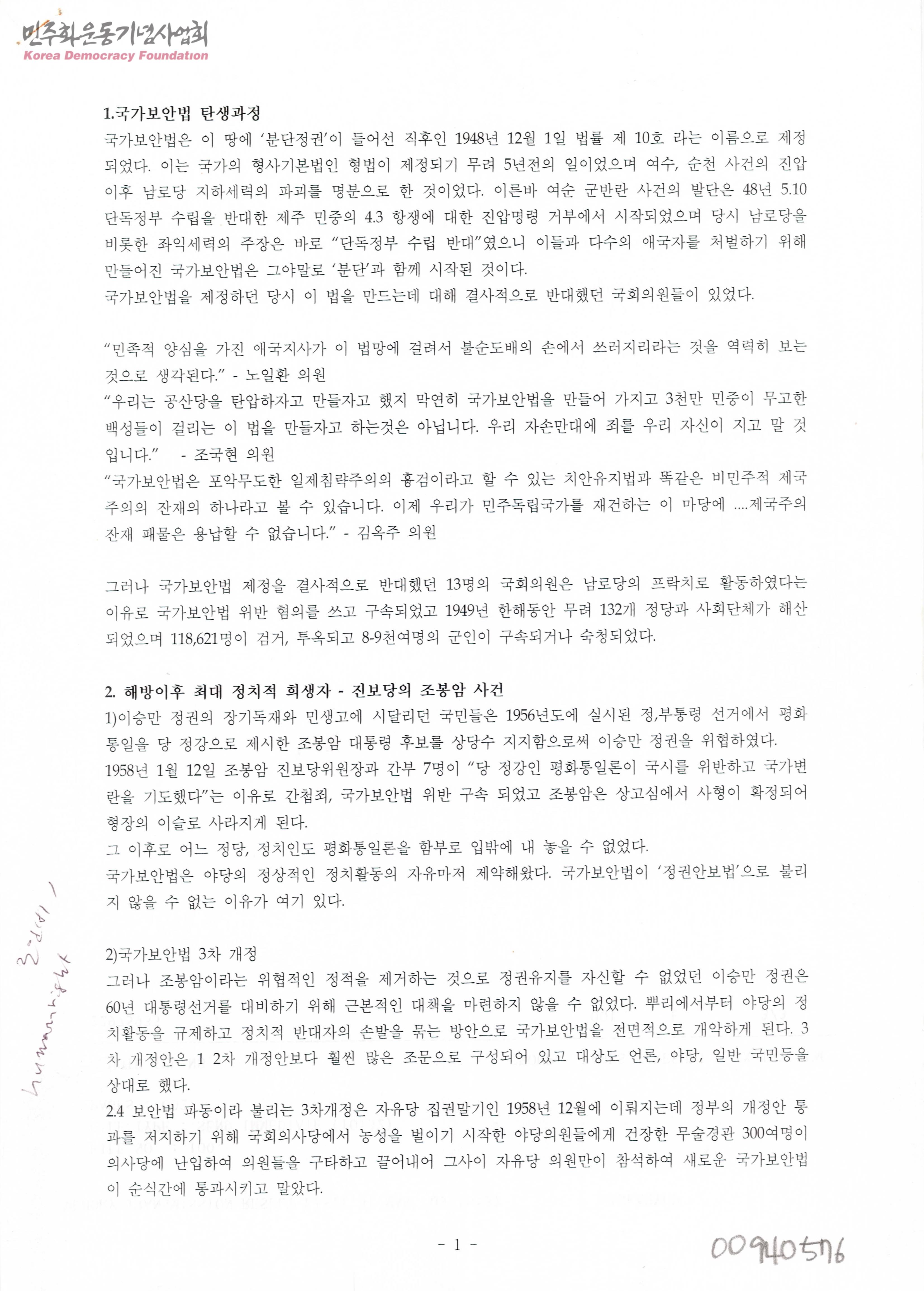 - 국가안보보다 분단을 악용한 정권이 정치적 반대를 탄압하는 수단으로 사용되는 국가보안법의 폐단과 철폐를 주장하는 내용의 글