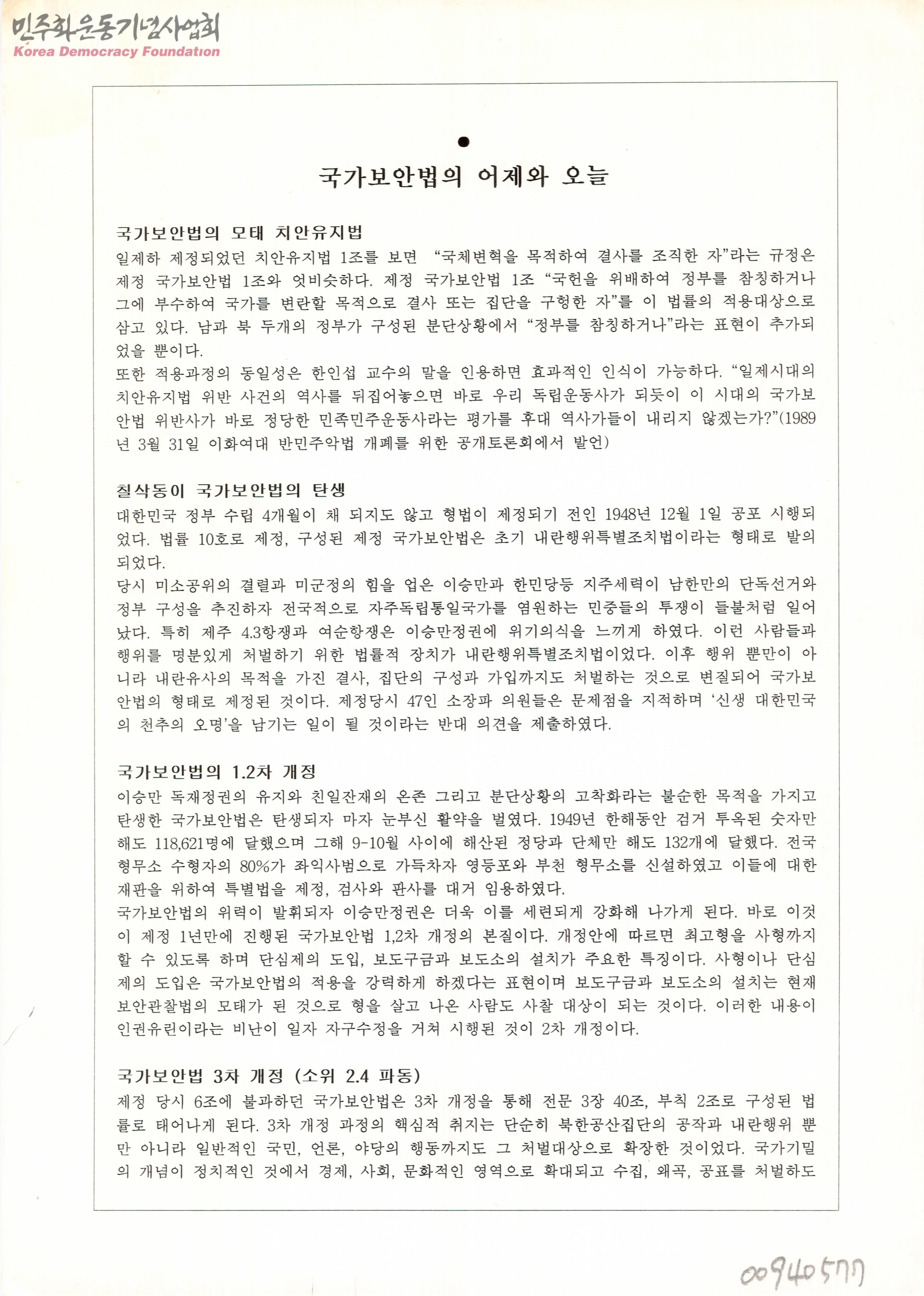 - 1948년 국가보안법의 탄생부터 시작하여 1차부터 3차 개정, 그리고 4·19 이후의 국가보안법 반대 학생시위와, 5·16 군부쿠데타와 함께 제정된 반공법, 이후 5공화국의 반공법과 국가보안법 통합에 이어 6공화국에서 공안정국 조성 등 국가보안법의 발전 양상을 서술한 글