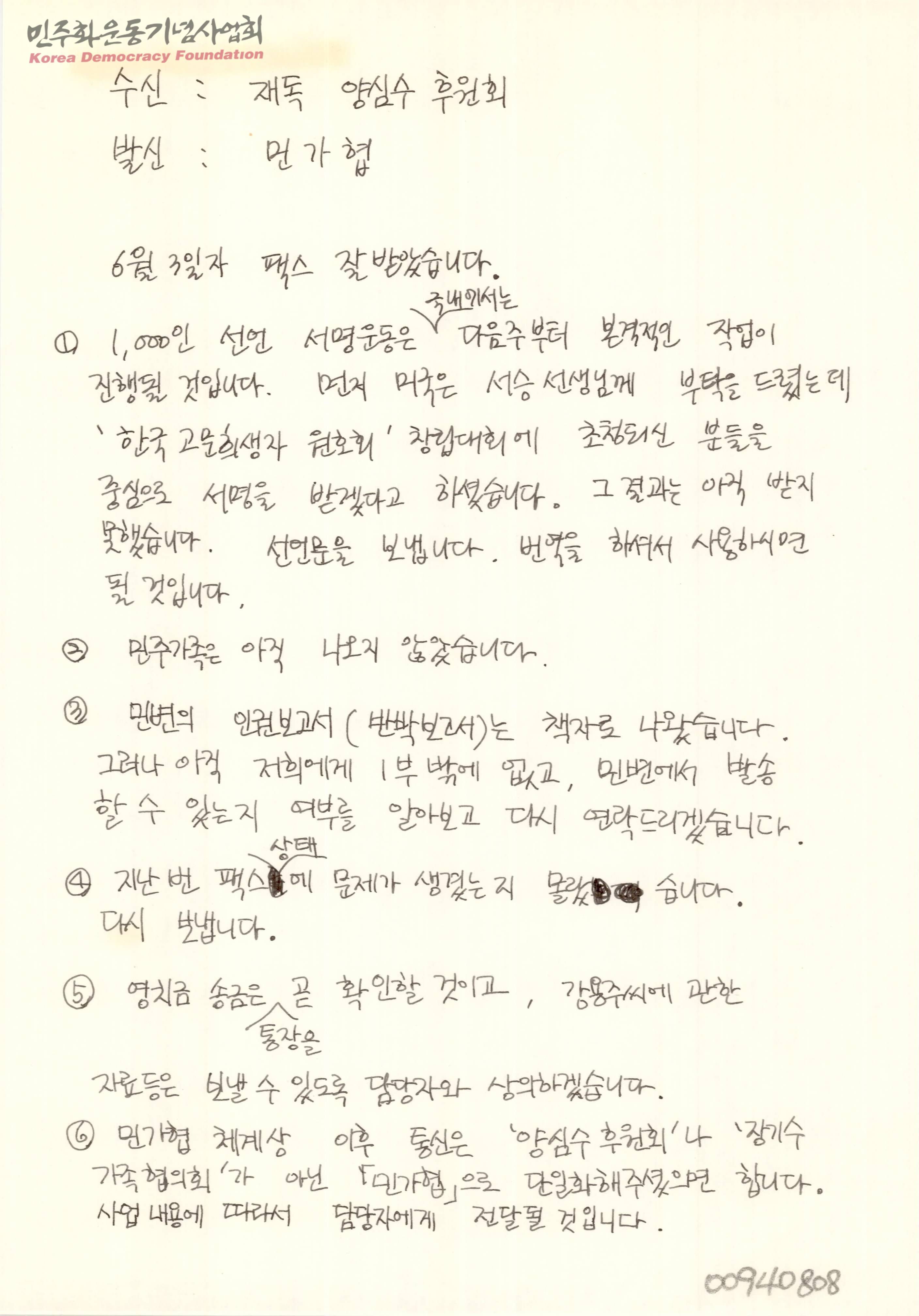 - 한국 고문 희생자 원호회' 중심으로 받기로 한 1000인 선언 서명운동 진행방식 및 상황과 민주가족 소식지에 대한 내용, 민변 인권보고서 진행상황에 대한 내용이 포함되어 있음