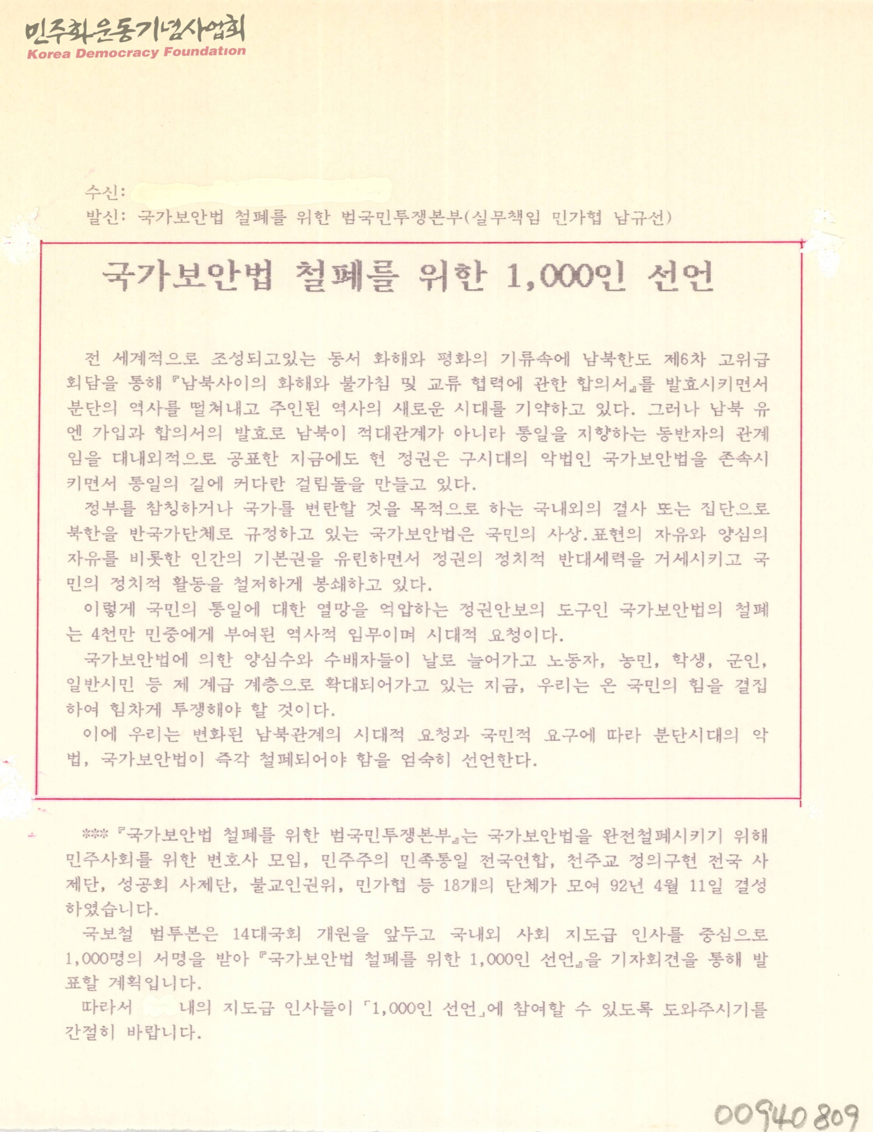 - 통일의 기류가 흐르고 있음에도 북한을 반국가단체로 보는 악법이자 민주열사들을 탄압하고 인권을 유린하는 국가보안법을 존속시키는 것에 반대해 국가보안법이 철폐되어야함을 선언한 내용이며 각종 민주단체들이 연합단체를 만들고 철폐를 위해 1000인 선언 서명운동을 할 것을 계획한 내용임