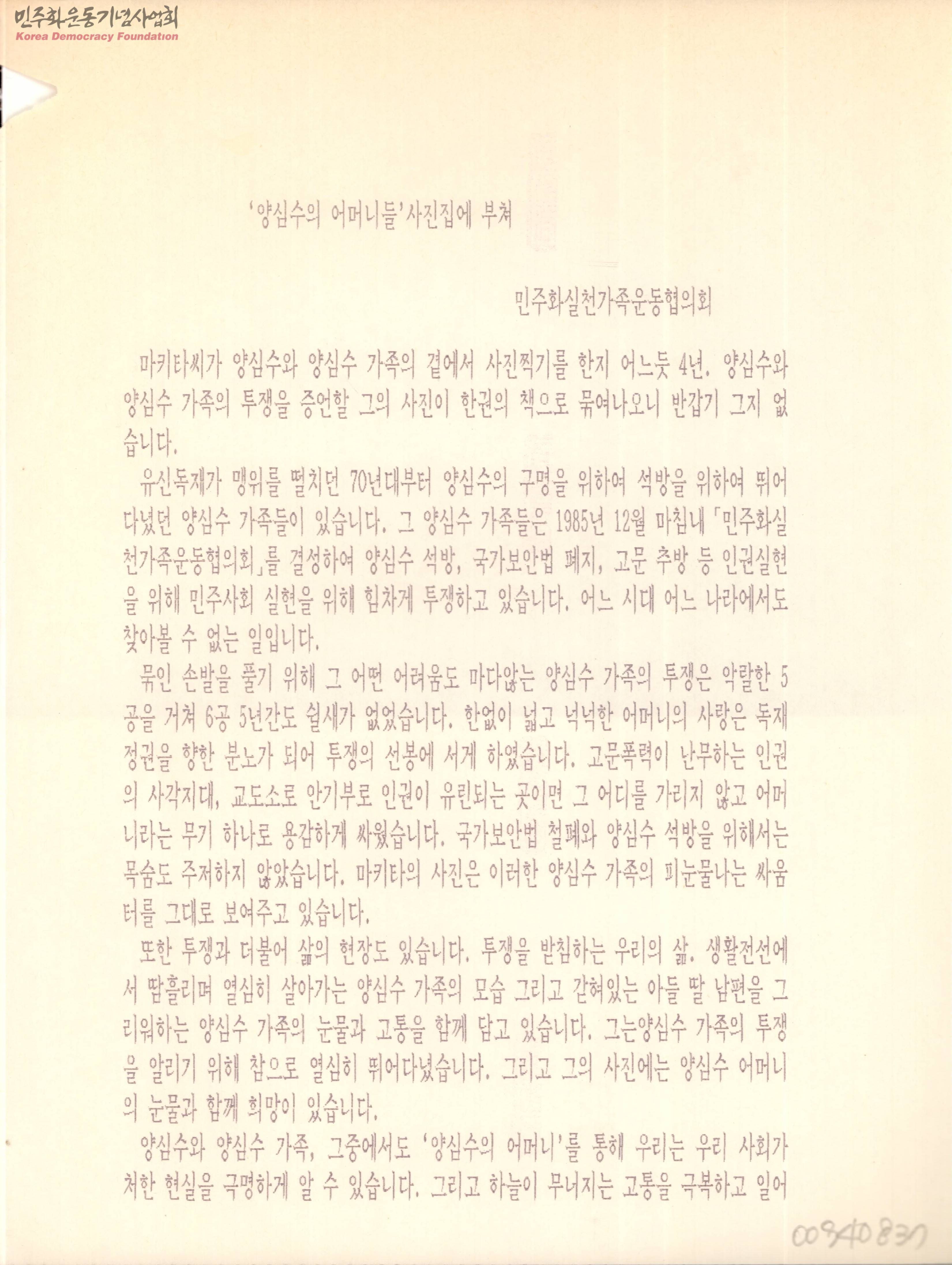 - 양심수 어머니들의 투쟁에 관한 내용 및 사진들이 책 한권에 묶여나오는 것을 반기는 내용으로 그들이 인권침해를 일삼는 국가보안법에도 두려워 하지 않고 열심히 투쟁해왔으며 사진집에는 양심수 가족의 눈물과 고통들이 담겨 있다고 말하고 있고 양심수들에 대한 전원석방을 바라는 내용임
