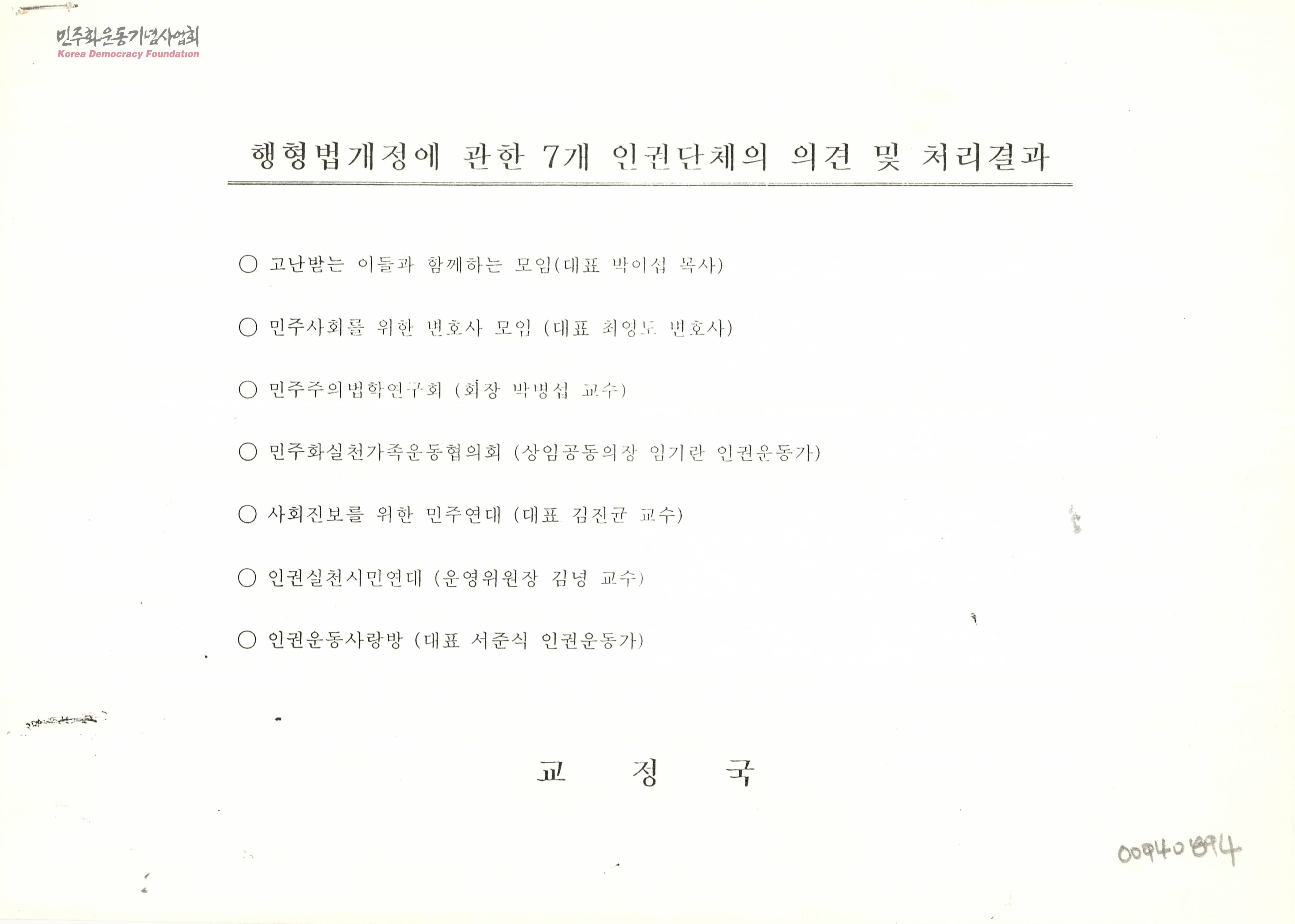 - 행형법 개정과 관련해 인권단체들이 광범위한 의견수렴 미흡과 사고의 전환과 그에 따르는 대체입법이 필요함 등과 같은 의견 및 충분한 여론 수렴을 통한 법안의 수정보완에 대한 내용임