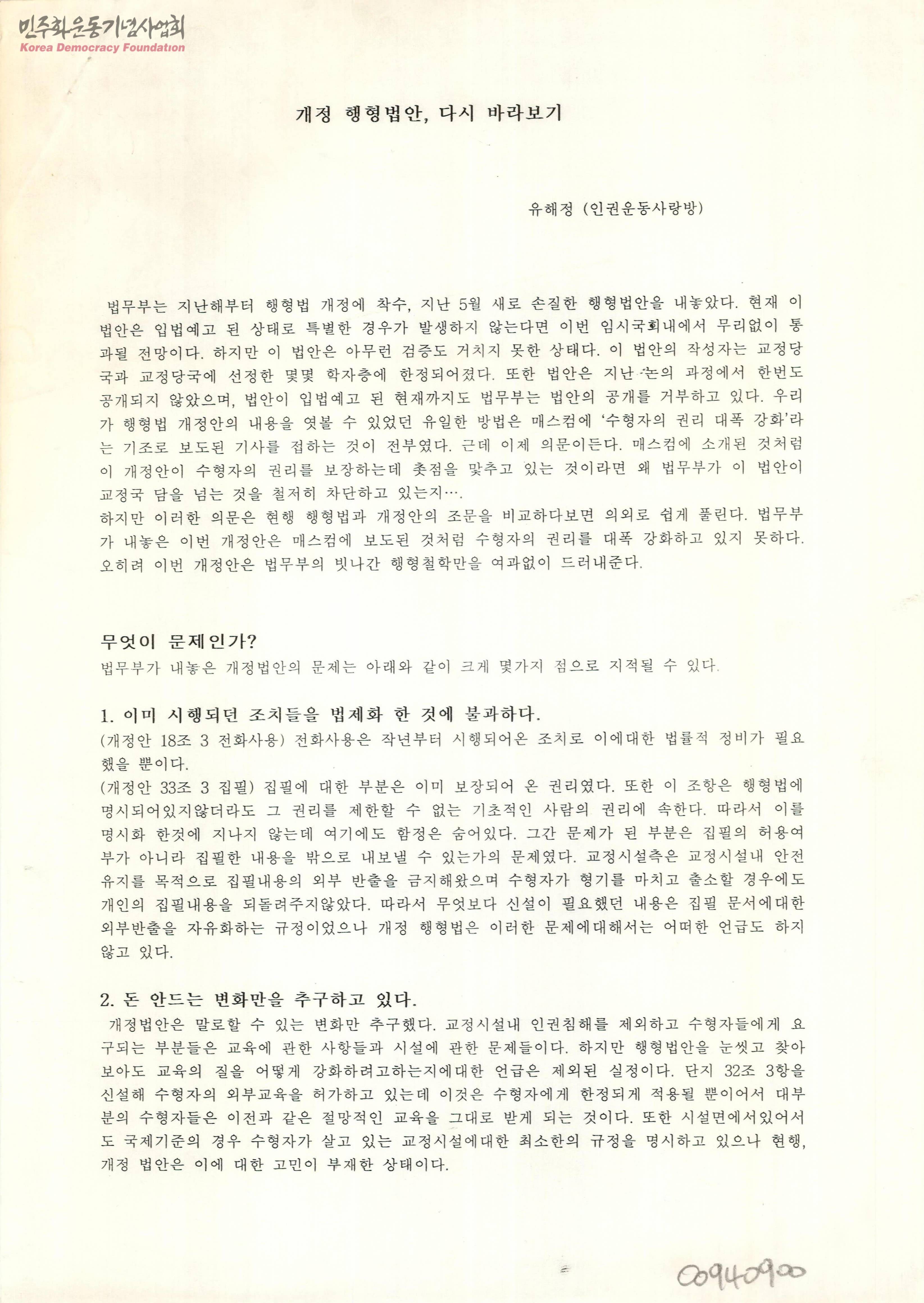 - 개정된 행형법안에 대해 분석하면서 합법적 영역내에서의 인권침해, 여성과 소수자들에 대한 미언급 등의 문제점을 기술한 내용으로 이 잘못된 행형법 개정안이 통과된다면 또 다시 수형자들이 법에 의해 인권침해를 경험하기 때문에 많은 관심과 법무부안 저지를 위한 노력을 부탁하는 내용