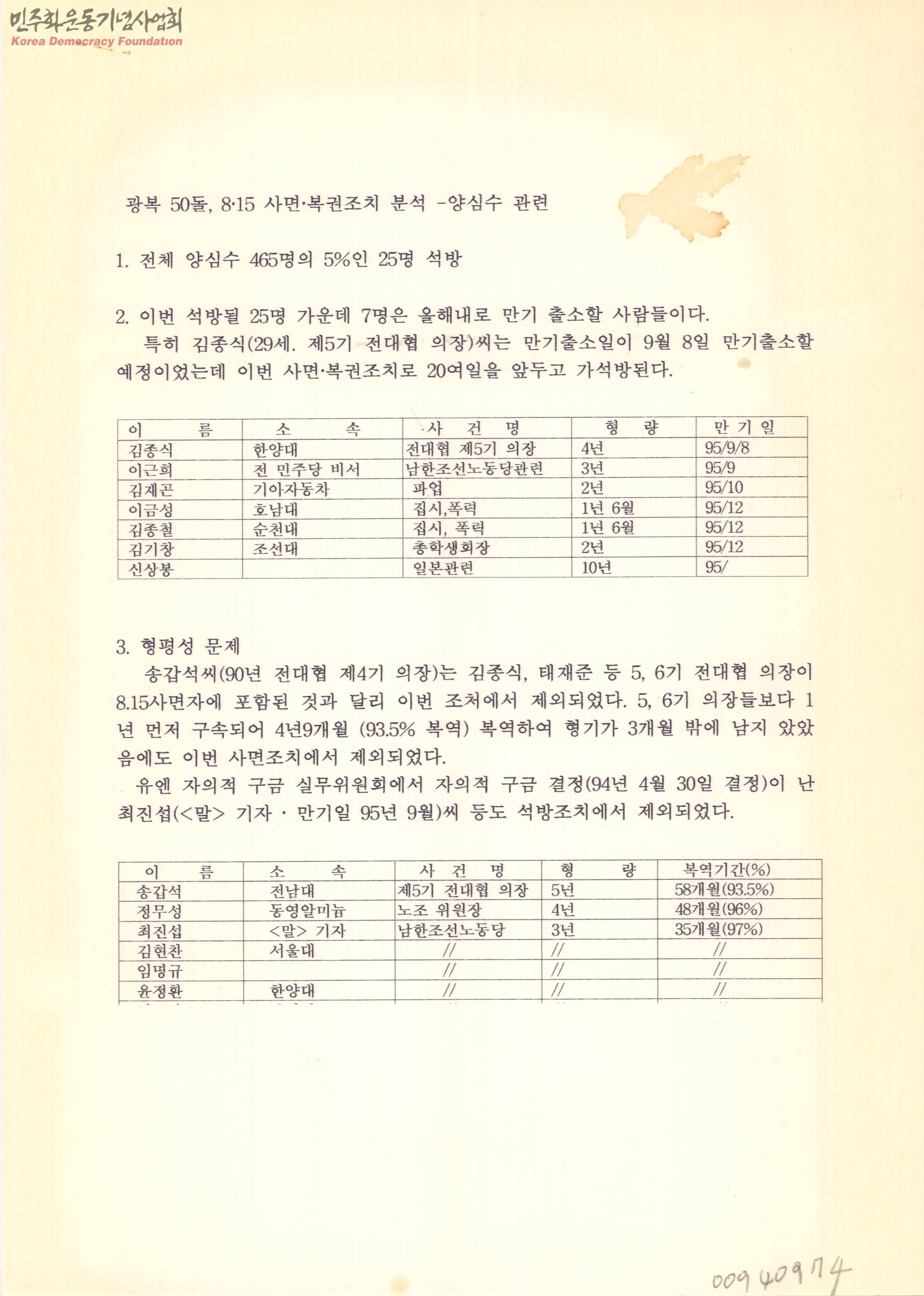 광복 50돌, 8∙15 사면∙복권조치 분석-양심수 관련