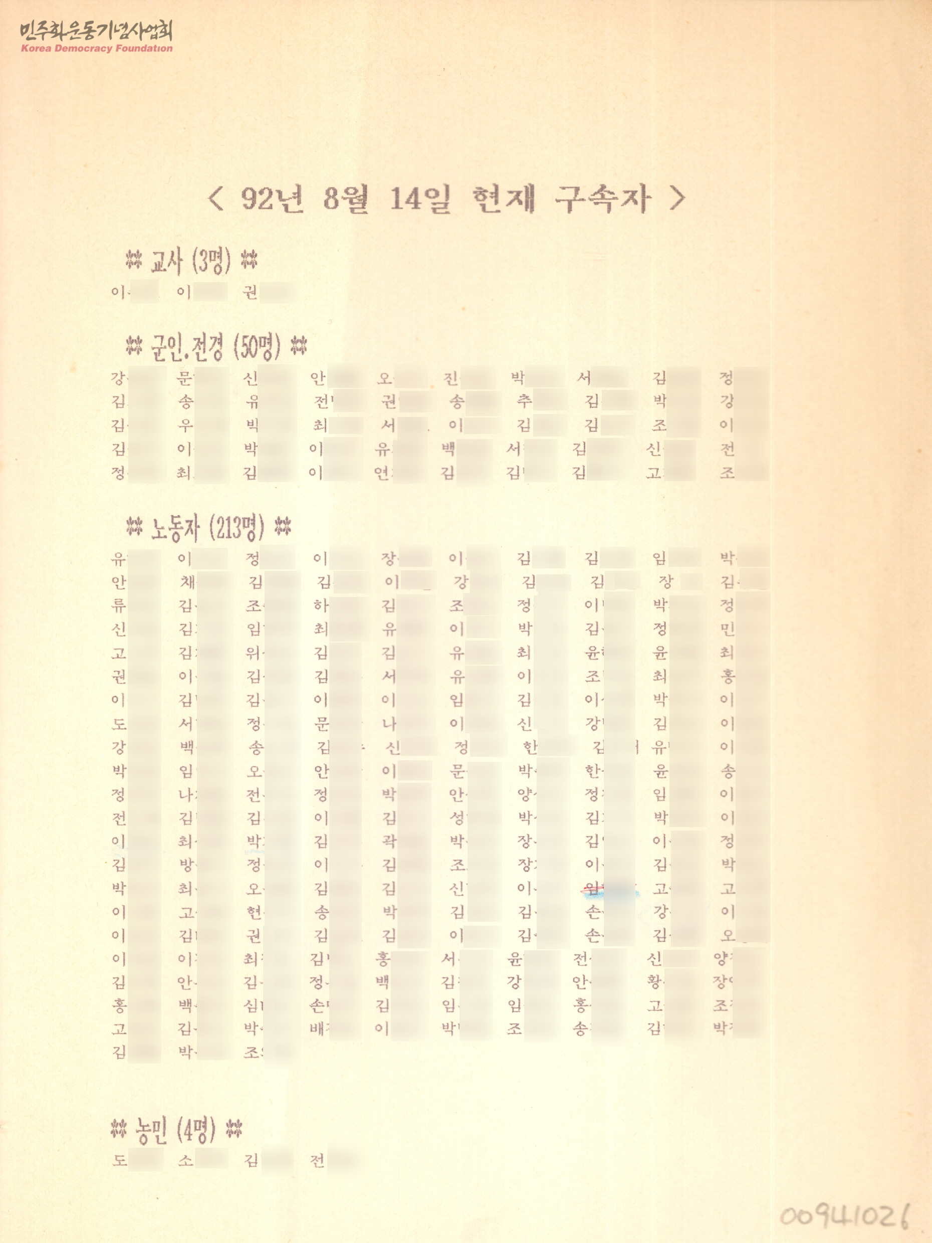 - 92년 8월 14일 기준 구속 양심수를 직업별로 분류한 명단.