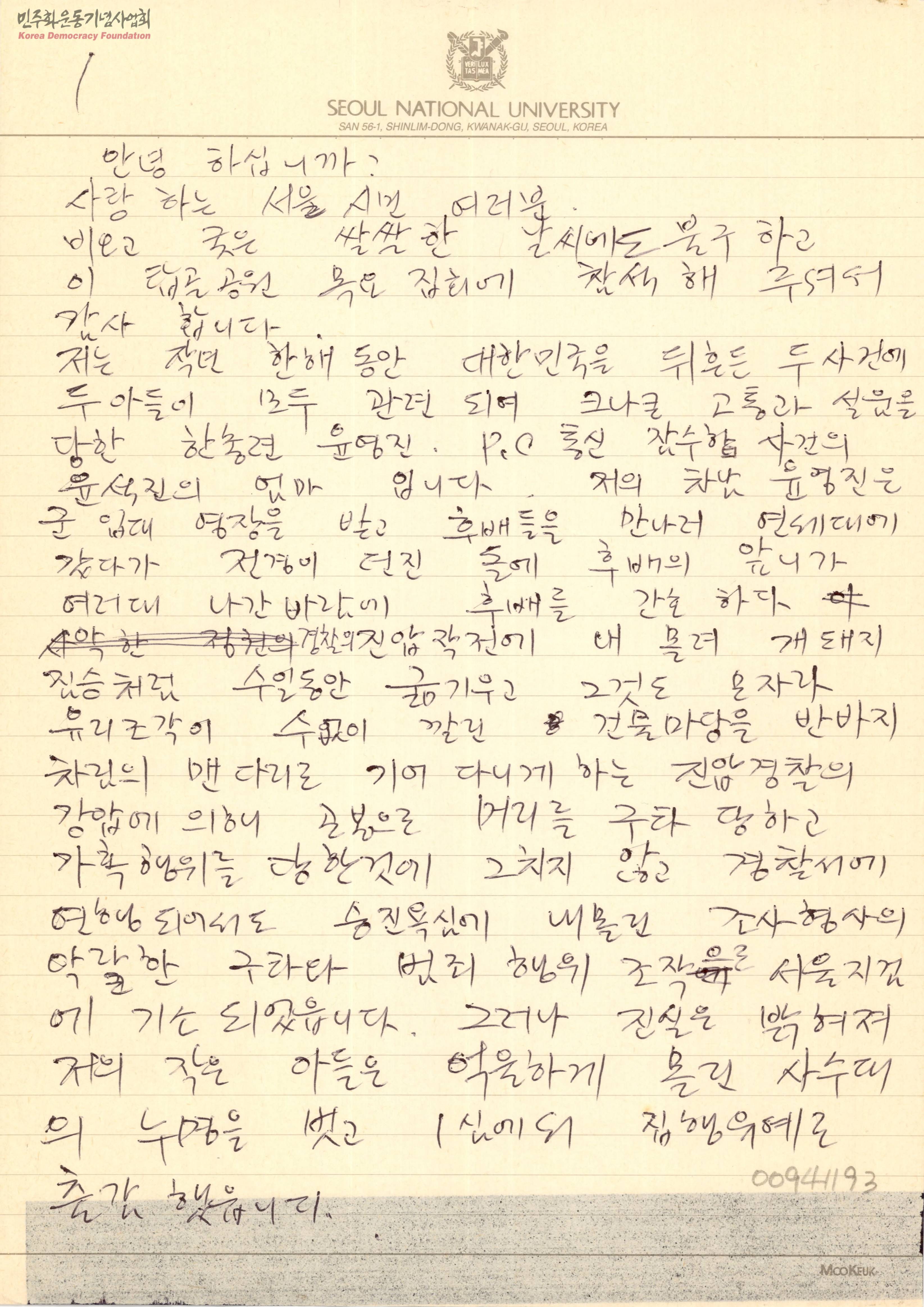 - 경찰의 무리한 진압작전으로 이유 없이 구속되어 가혹행위를 당한 윤영진과 P.C 통신 잠수함 사건으로 연행되어 세 달간 옥살이를 한 윤석진이 겪었던 일들에 대한 내용과 윤석진의 무죄를 보도해준 신문사에게 감사를 전하는 내용을 담은 윤영진, 윤석진의 어머니의 자필 목요집회 발표문