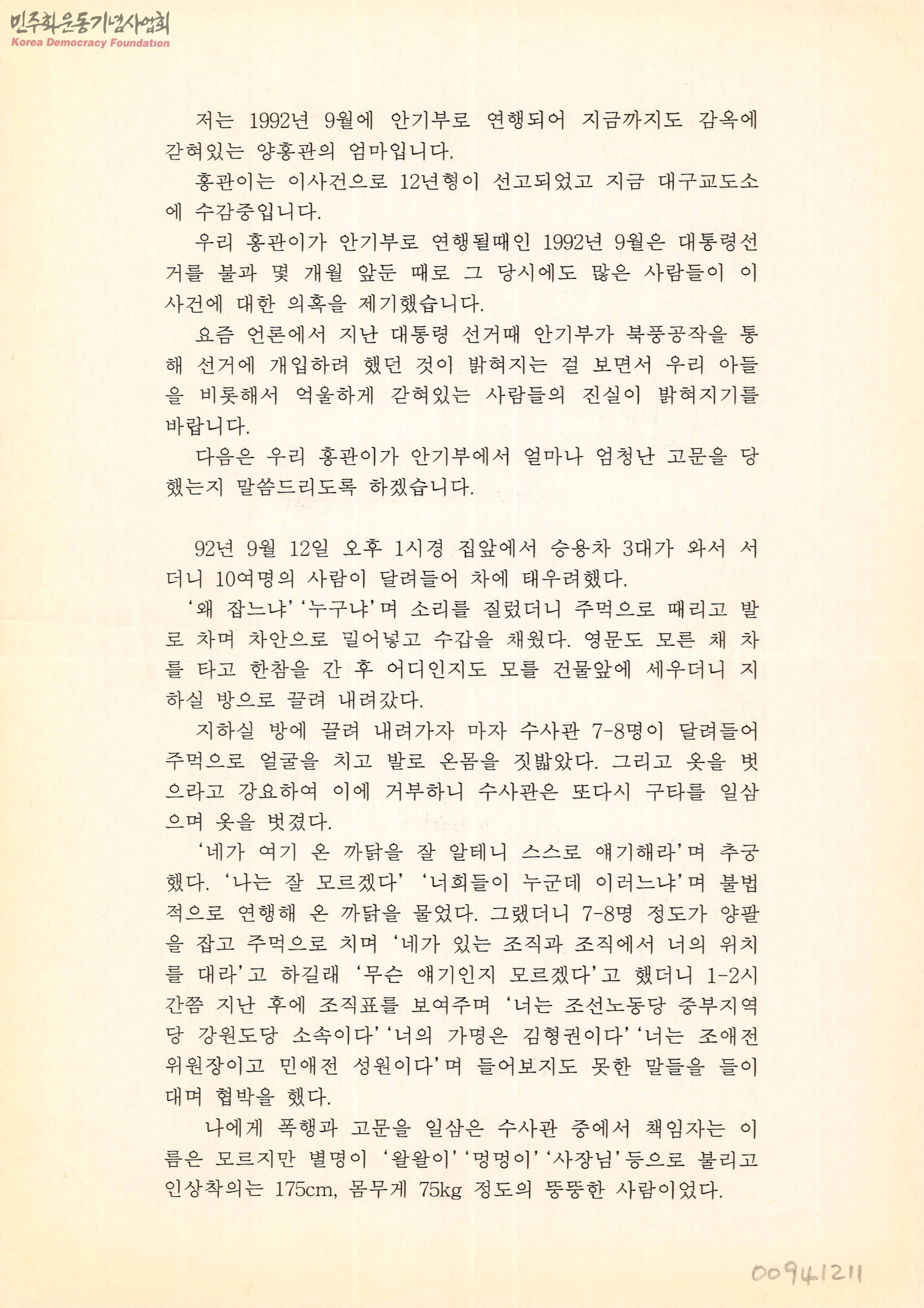 - 양홍관이 92년 9월 북풍공작으로 연행되어 수사관들의 가혹행위로 인해 허위진술을 하여 12년형 선고를 받고 수감중이라는 내용의 글