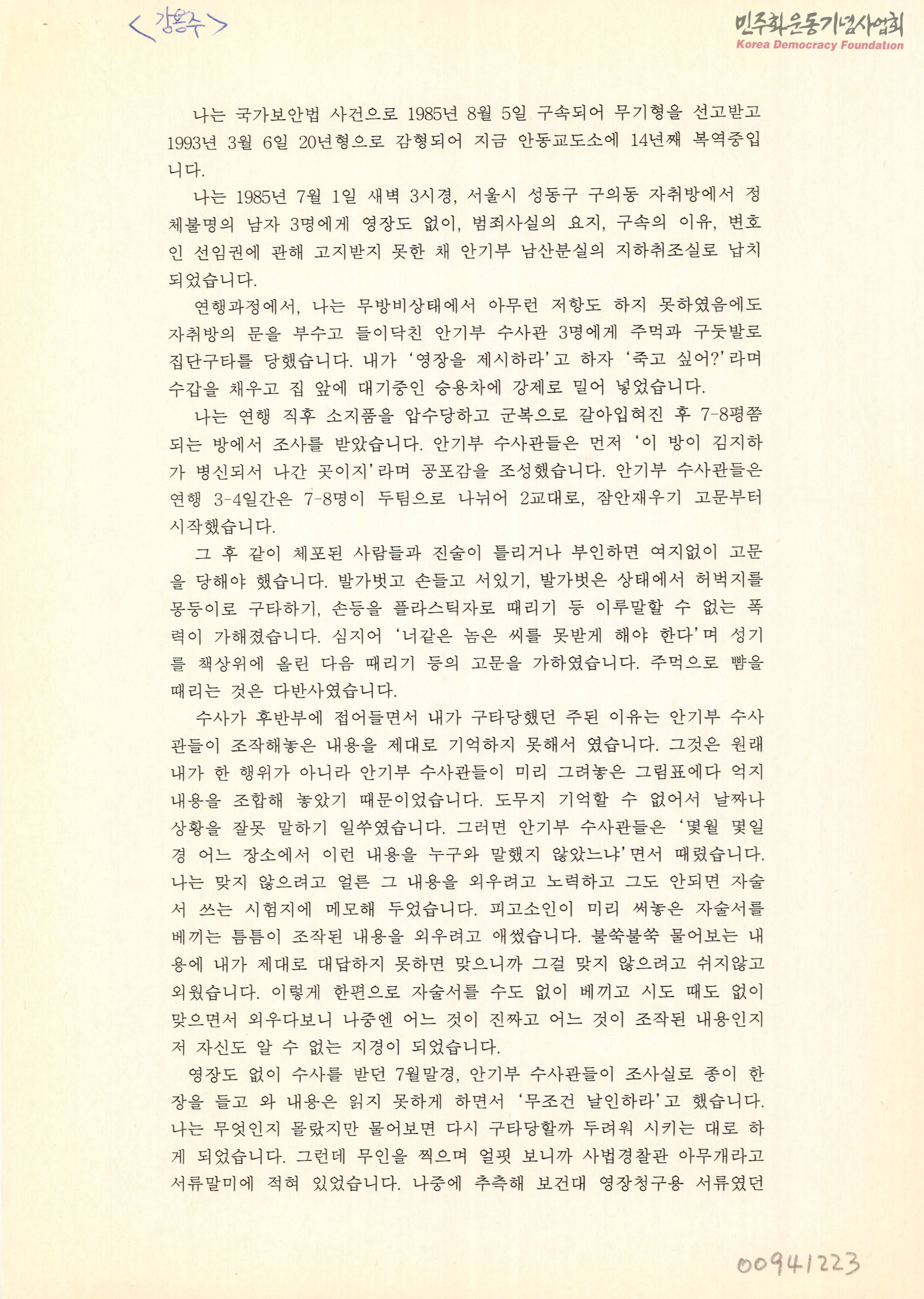 - 경찰의 가혹행위로 인해 허위자백을 하여 14년째 복역중인 강용구가 당시 구속상황과 수사과정에 대해 적은 글