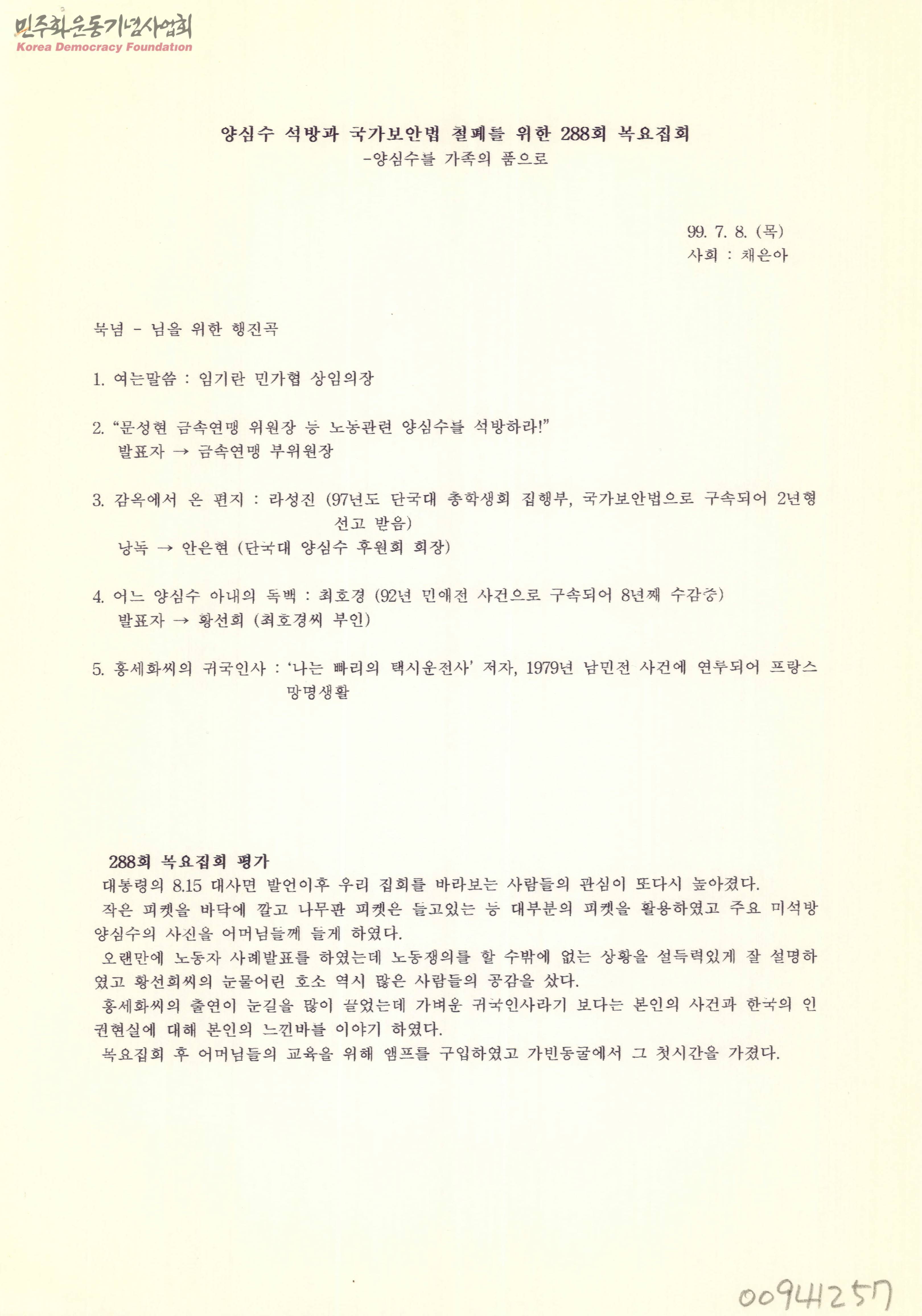 - 288회 목요집회의 순서와 평가가 담긴 문서로 국가보안법 위반으로 구속된 라성진이 부모님께 보내는 편지가 별첨되어 있음
