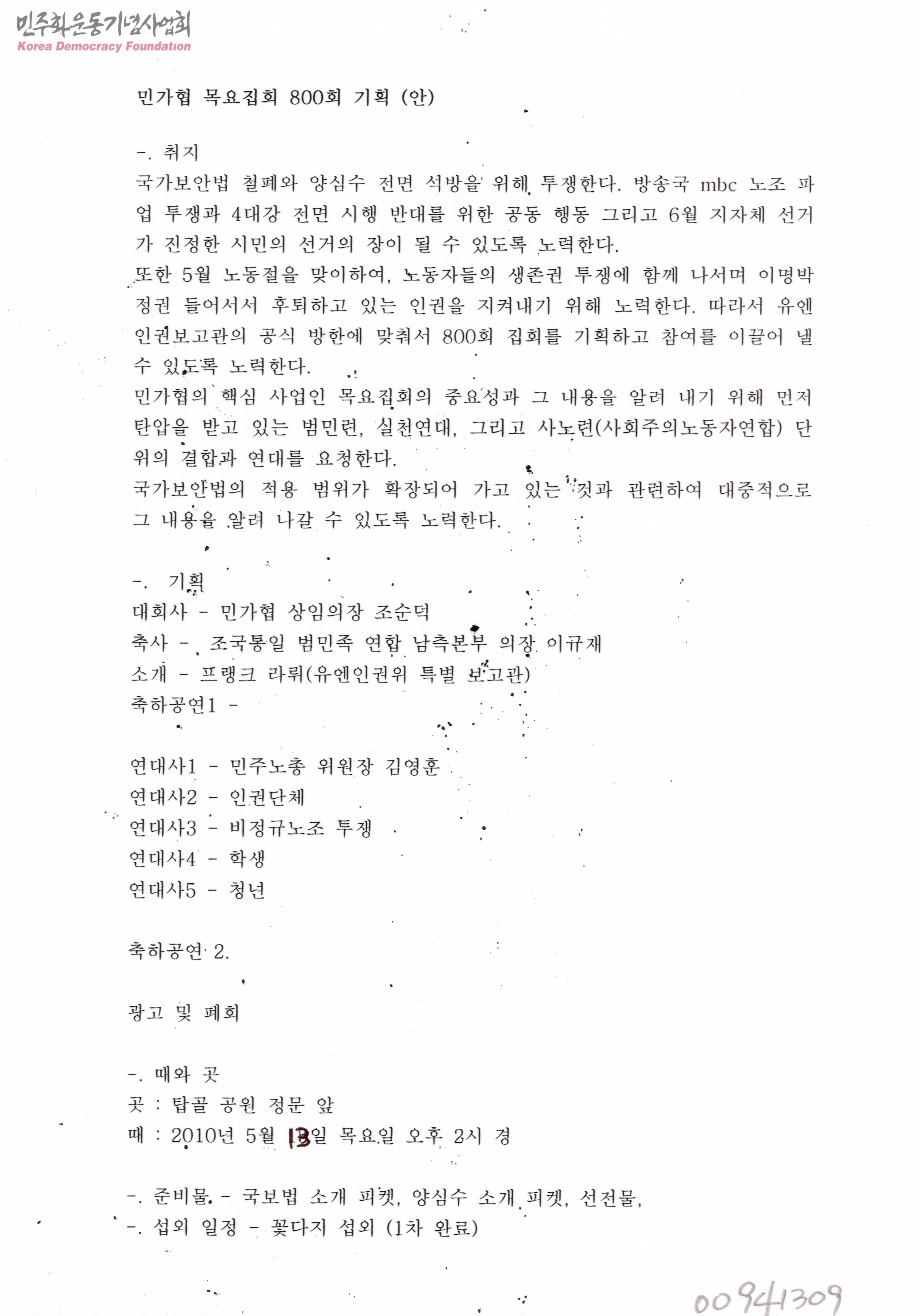 - 국가보안법 철폐와 양심수 전면 석방을 위한 투쟁 및 민가협의 목요집회에 대한 기획 내용