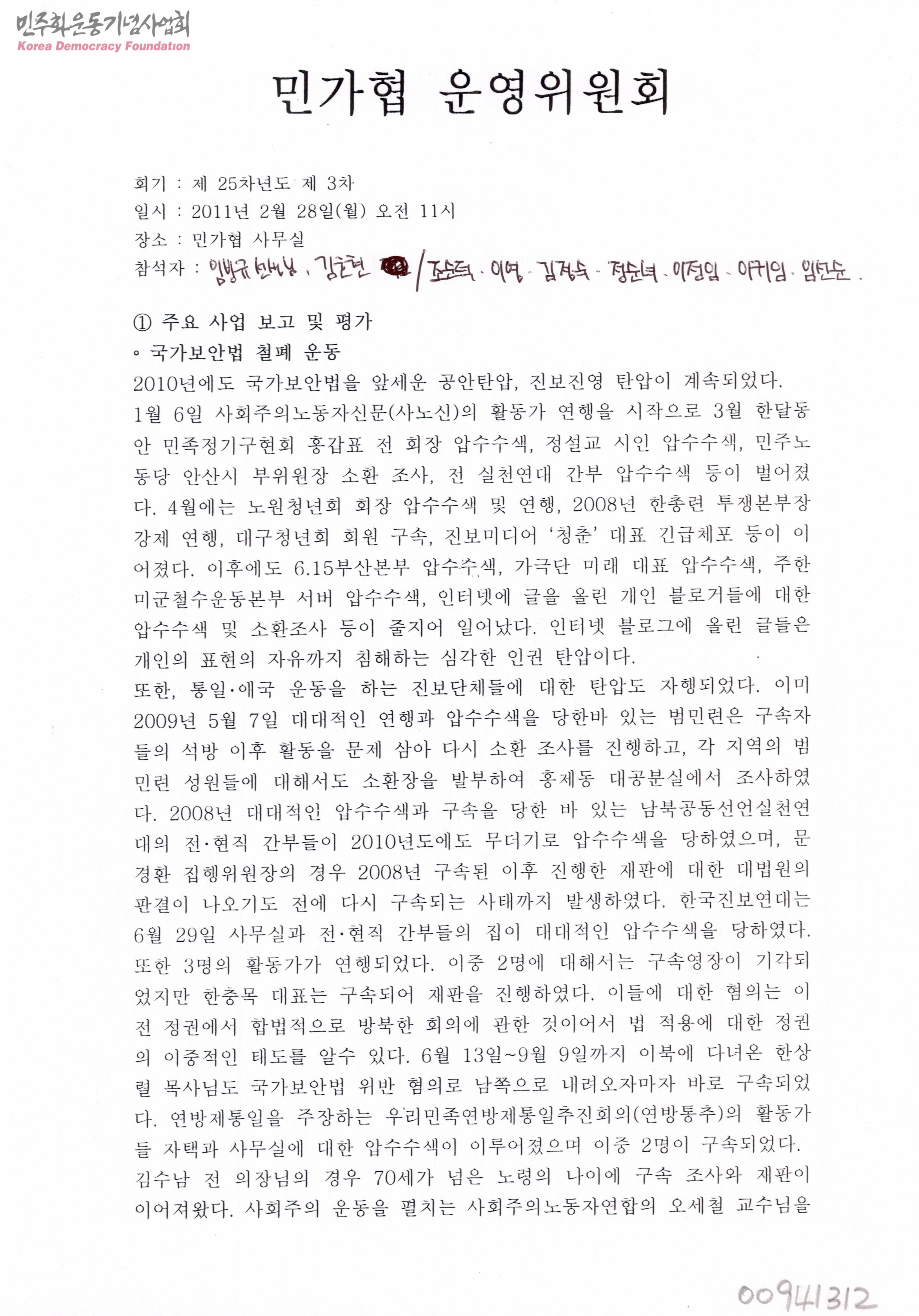 - 국가보안법 철폐운동, 반미반전, 6.15/10.4선언 지지 이행, 집시법 개악 반대 투쟁, 국가인권위 현병철위원장 사퇴 촉구 투쟁 등 민가협의 주요 사업 및 평가 내용