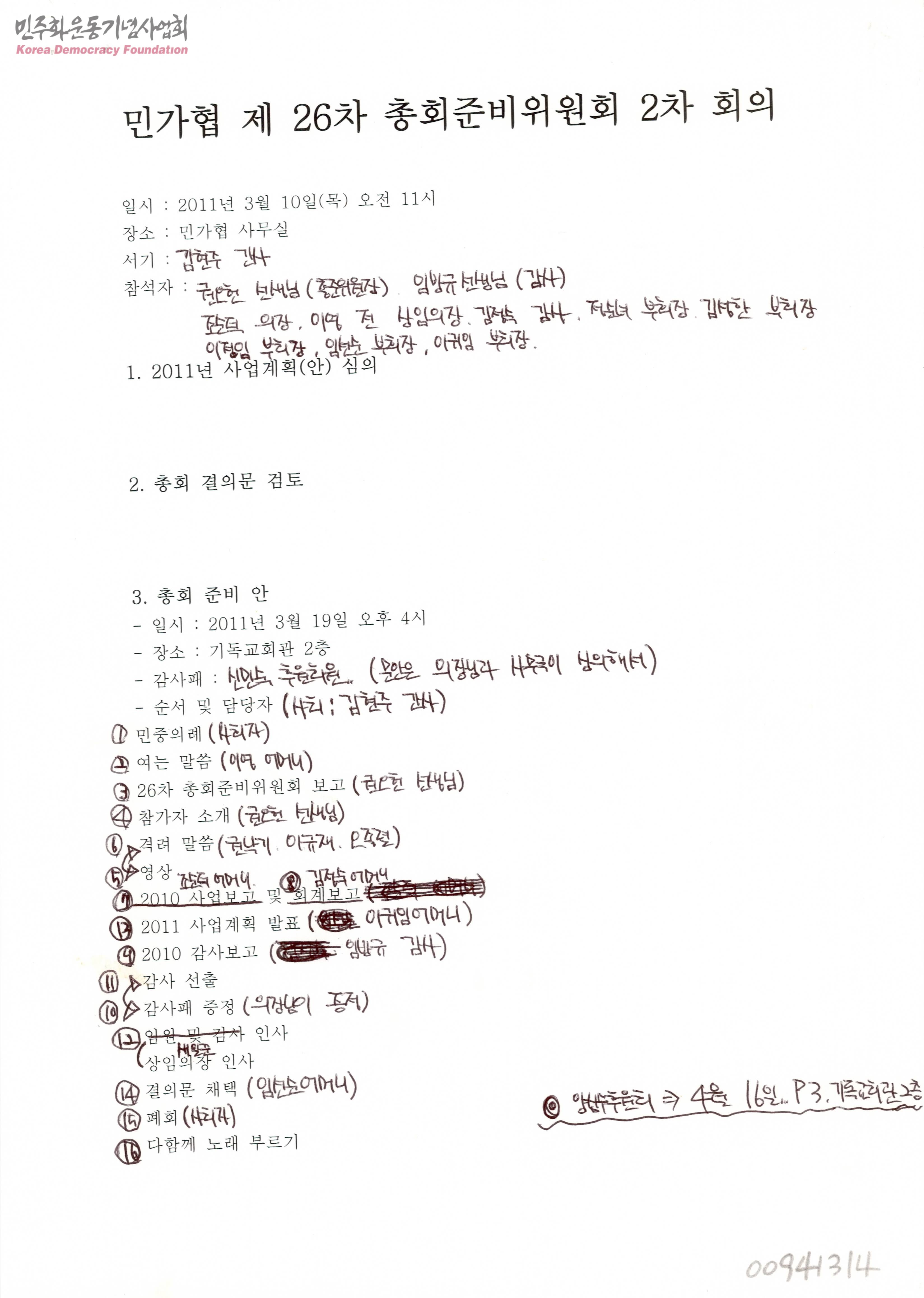- 이명박 정권과 관련된 국가보안법 철폐운동과 양심수 석방 사업 등 민가협의 2011년 사업 계획 내용, 감사패 사진 출력본과 2010년 재정 감사보고및 상임의장 조순덕씨의 인사말