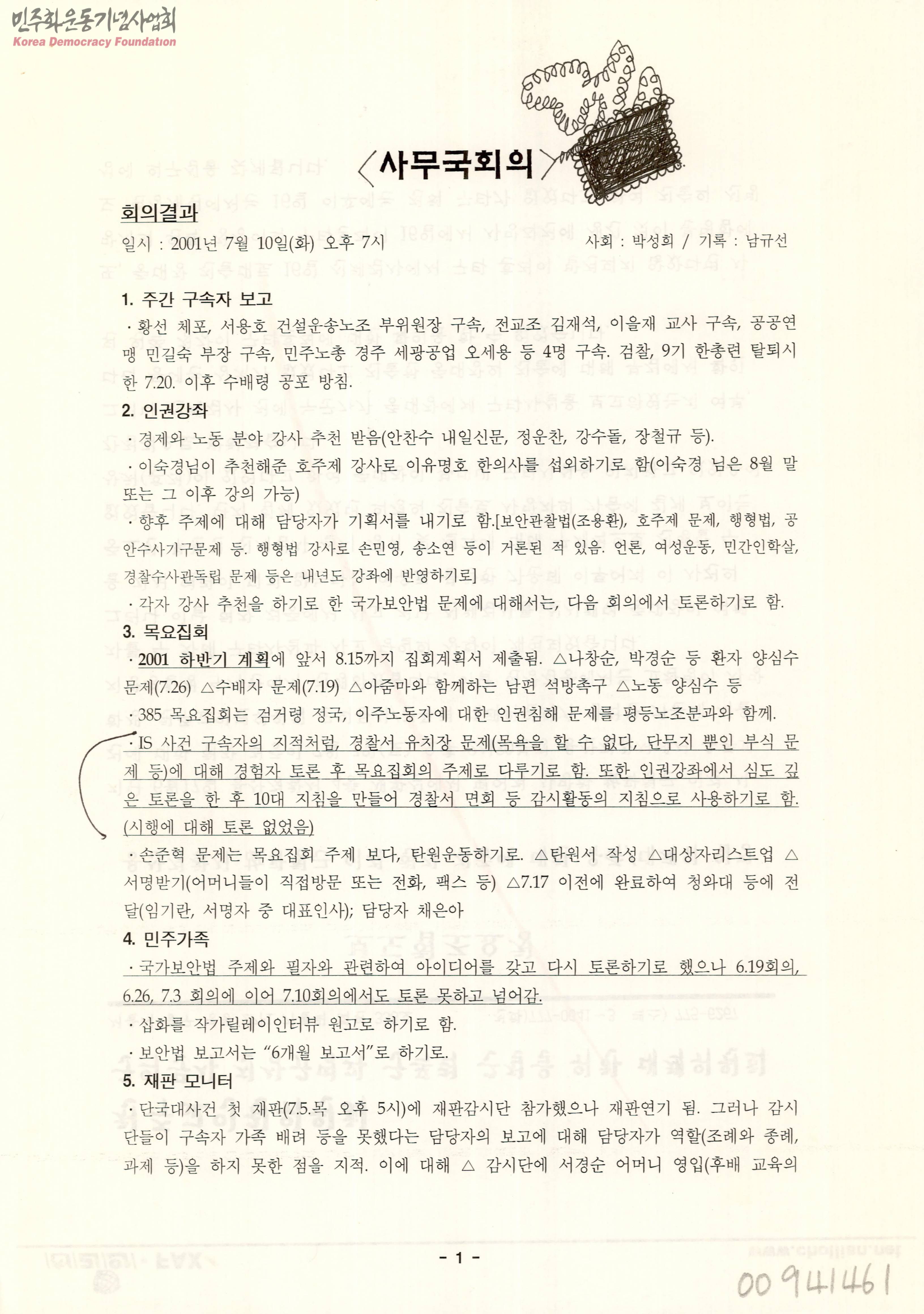 - 단국대사건 첫재판 모니터 내용과 민주가족 , 목요집회 등 2001년 7월 10일 회의결과에 대한 내용 및 7월 16일 정기사무국회의 보고 자료